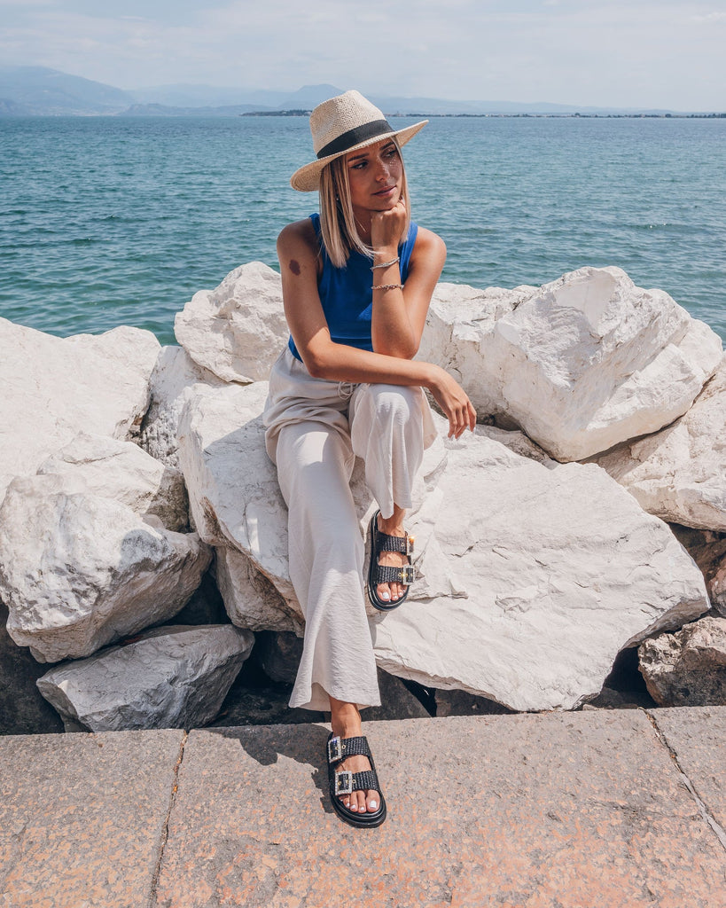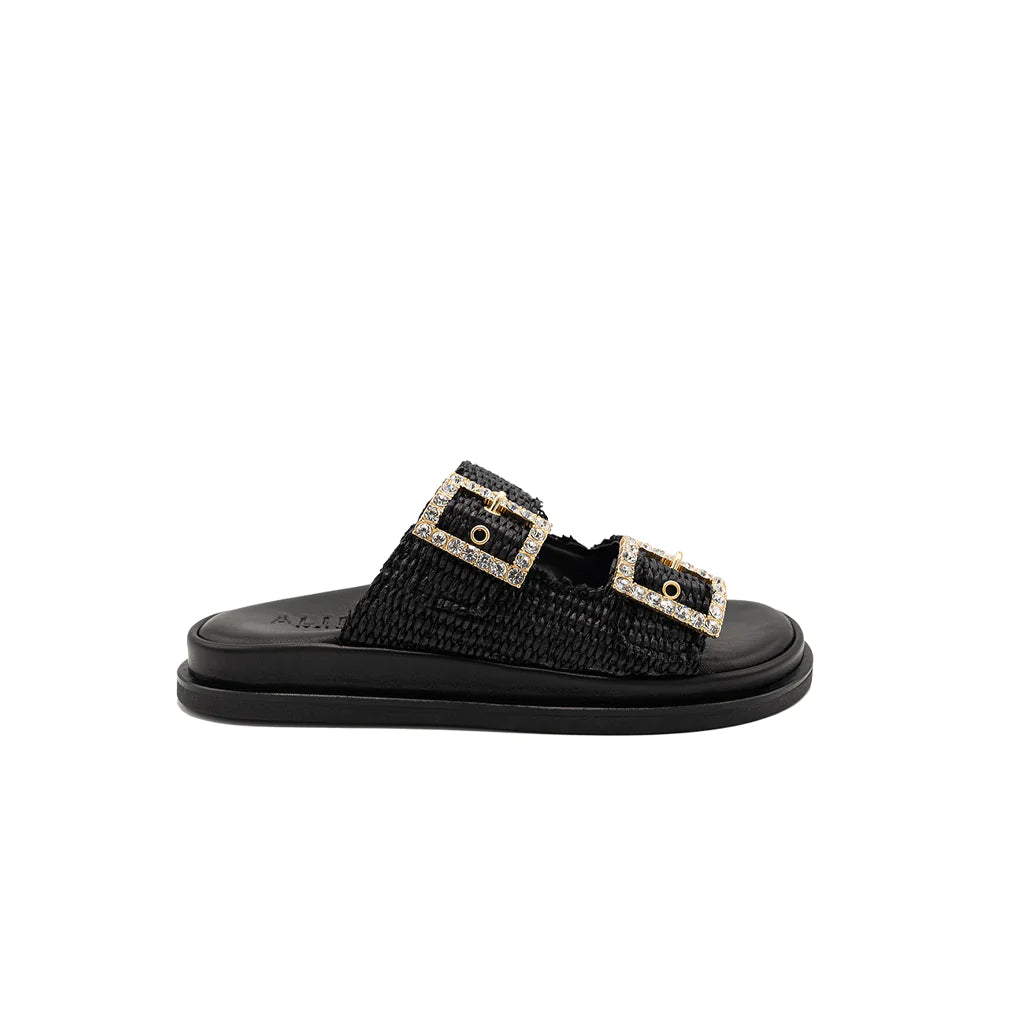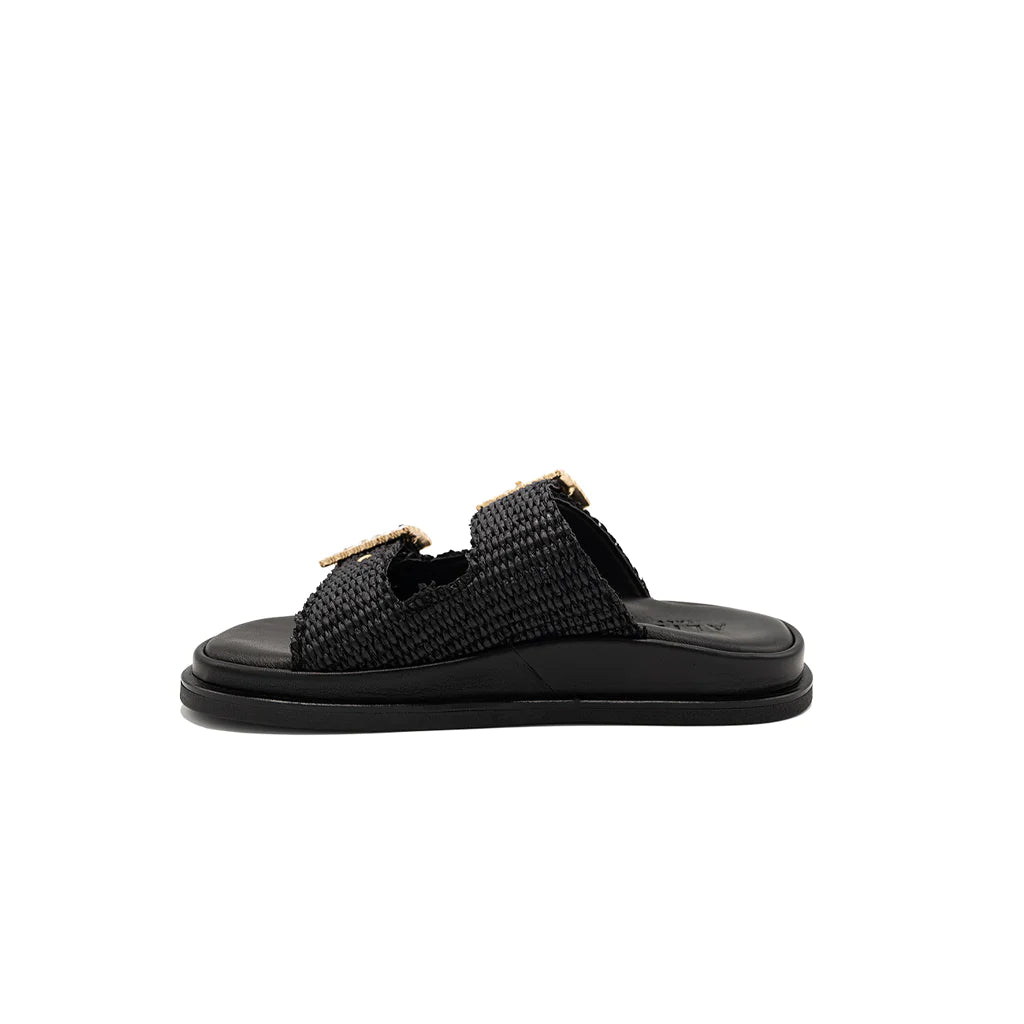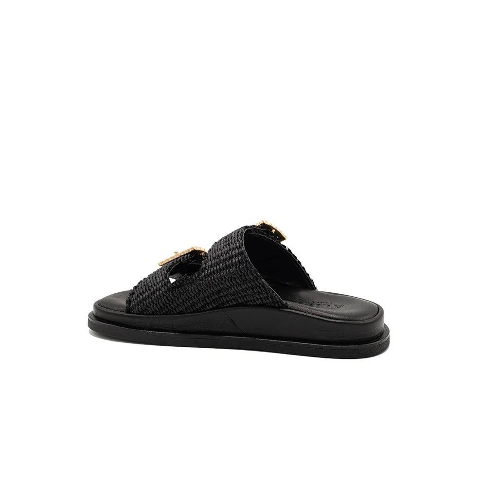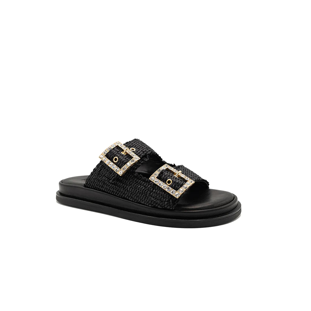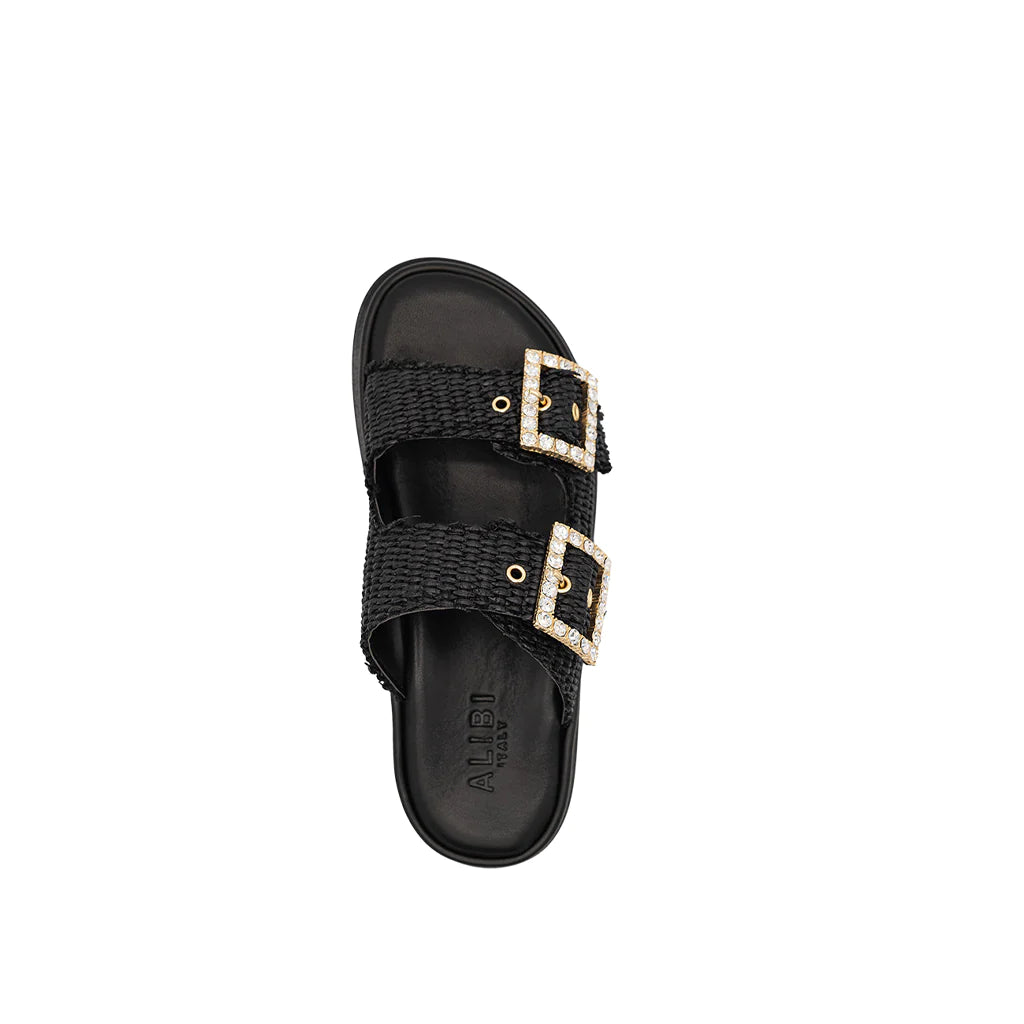 Greta black sandals will be perfect for your summer looks! They have a double band upper in raffia, with a soft memory leather insole. The summery and romantic design embellished with jewel buckles gives charm and refinement, for a sandal suitable for all times of the day. Handmade in Italy by expert craftsmen.
