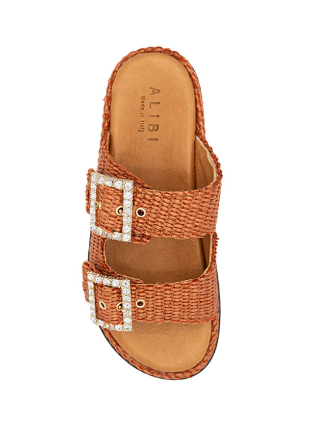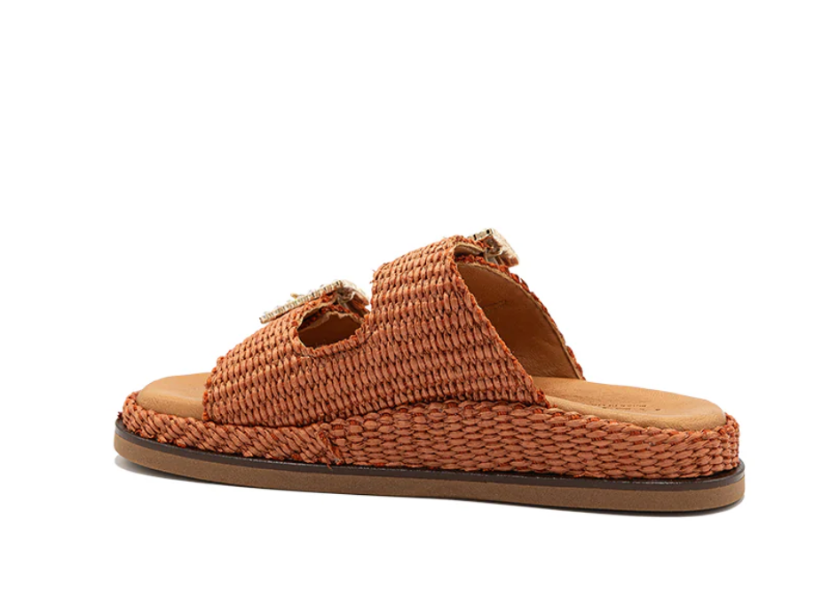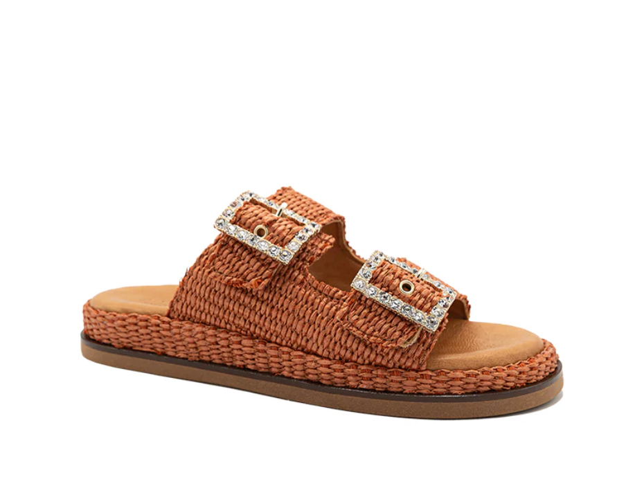 Greta brick colored sandals will be perfect for your summer looks! They have a double band upper in raffia, with a soft memory leather insole. The summery and romantic design embellished with jewel buckles gives charm and refinement, for a sandal suitable for all times of the day. Handmade in Italy by expert craftsmen.