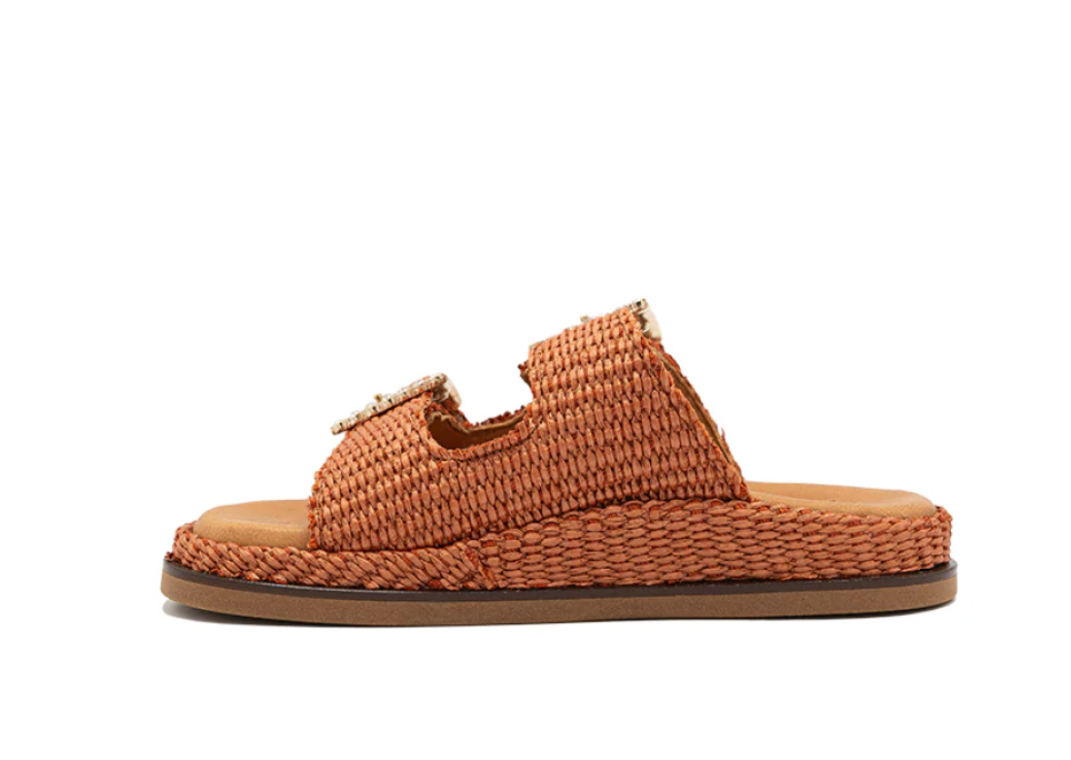 - Top in raffia. | Leather lining | Side jewel buckles | Leather memory insole.