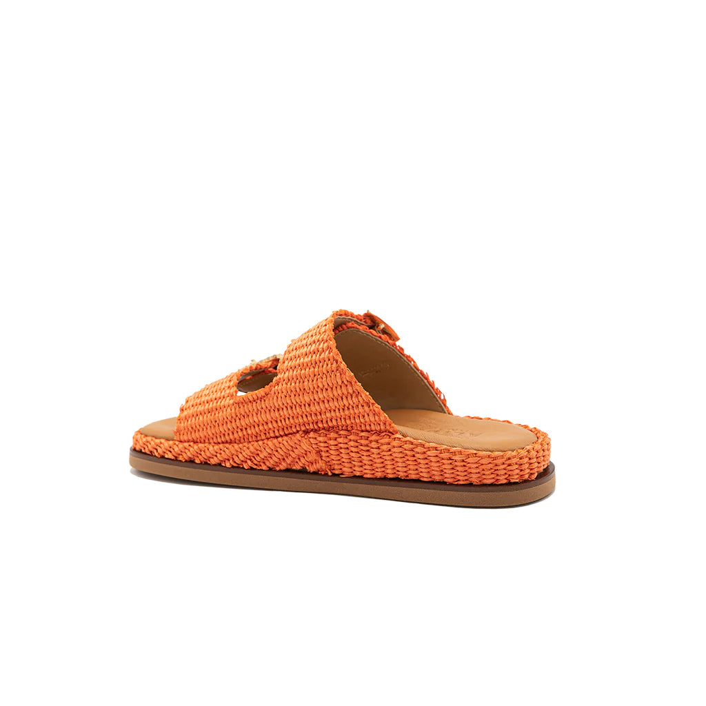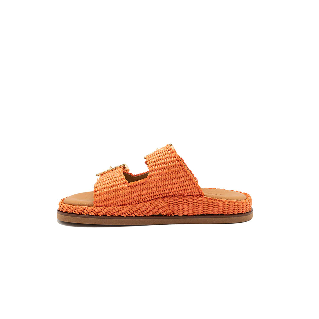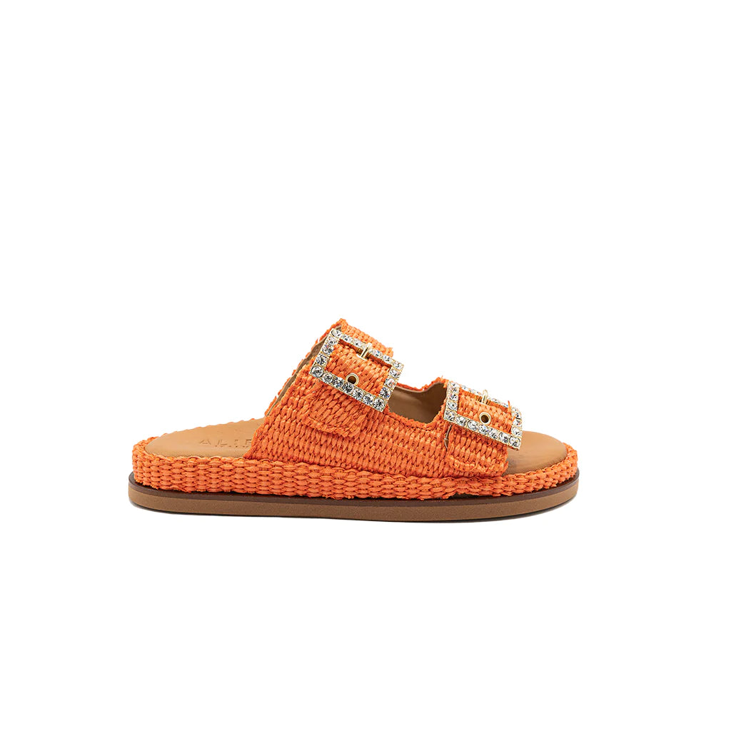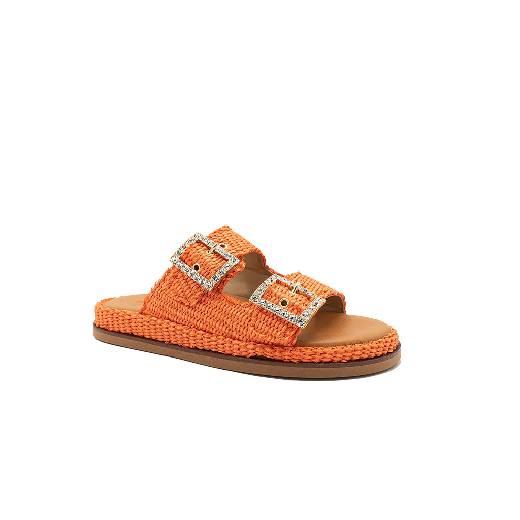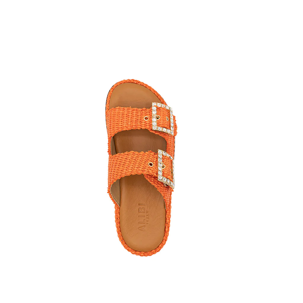 Greta orange sandals will be perfect for your summer looks! They have a double band upper in raffia, with a soft memory leather insole. The summery and romantic design embellished with jewel buckles gives charm and refinement, for a sandal suitable for all times of the day. Handmade in Italy by expert craftsmen.