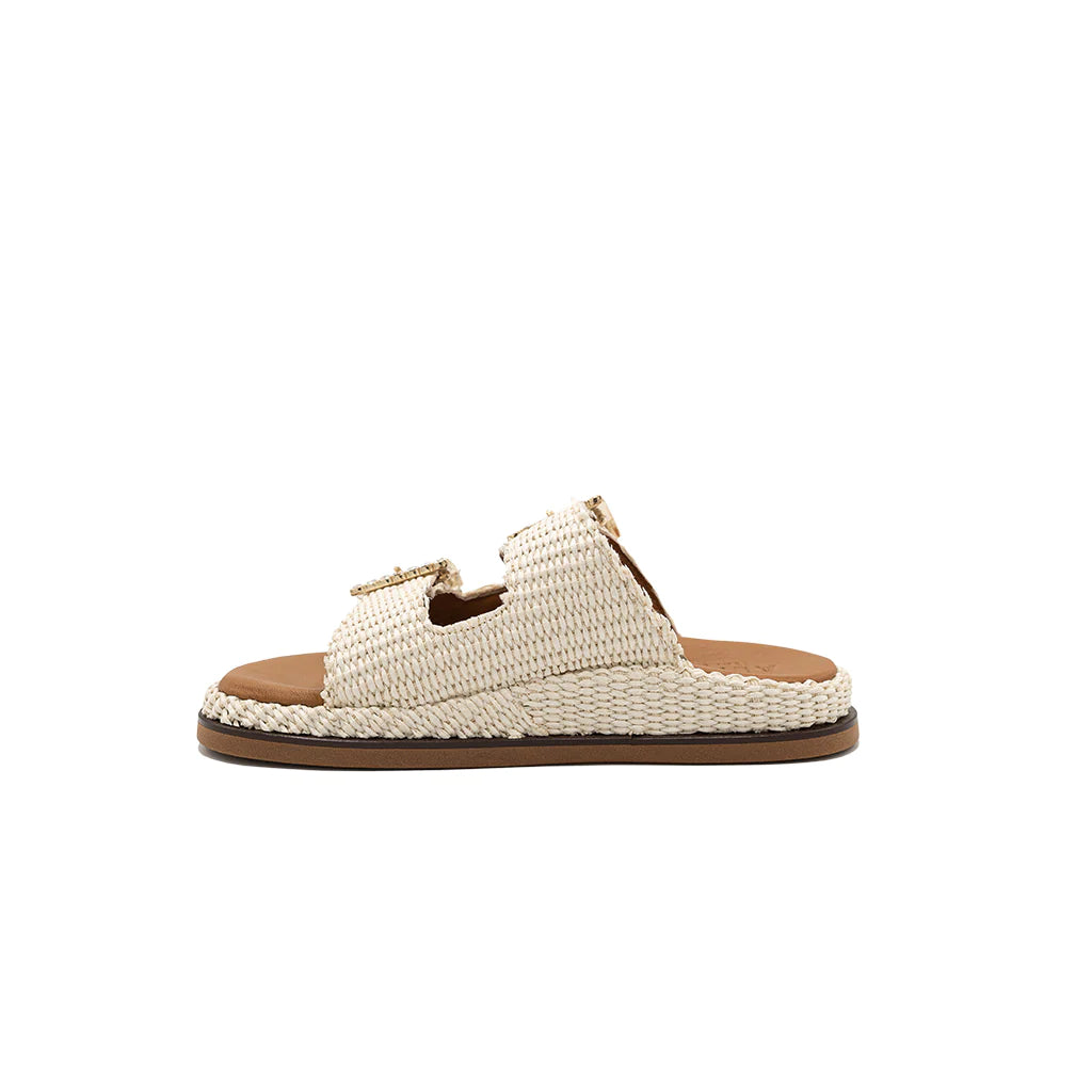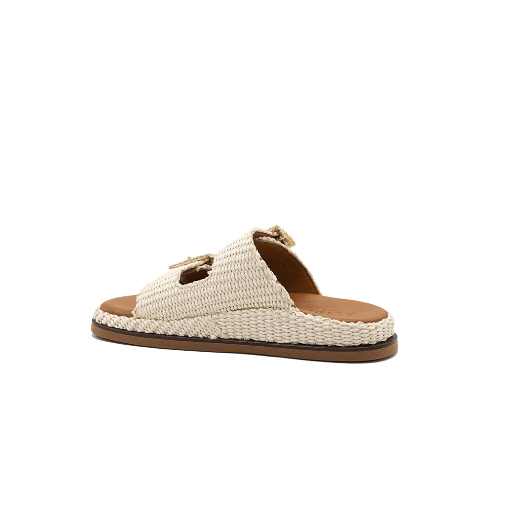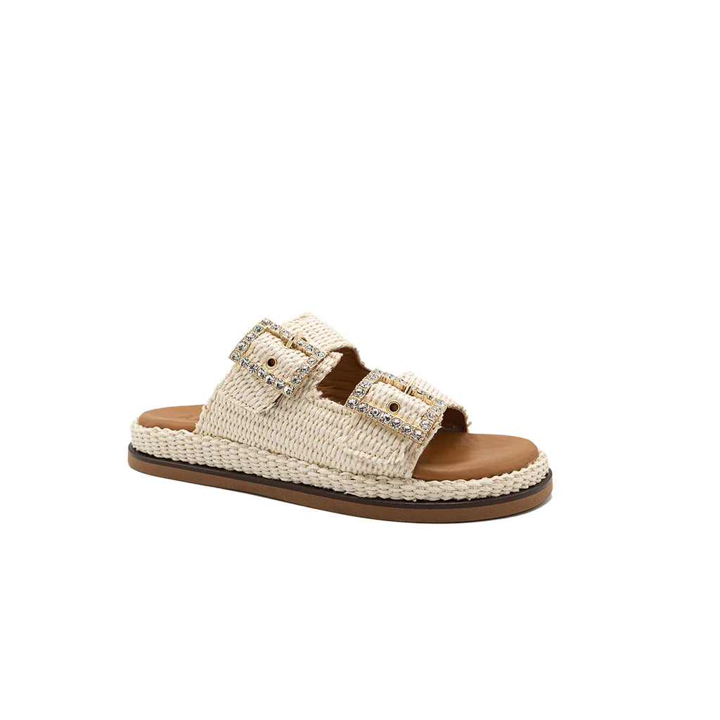 - Top in raffia. | Leather lining | Side jewel buckles | Leather memory insole.