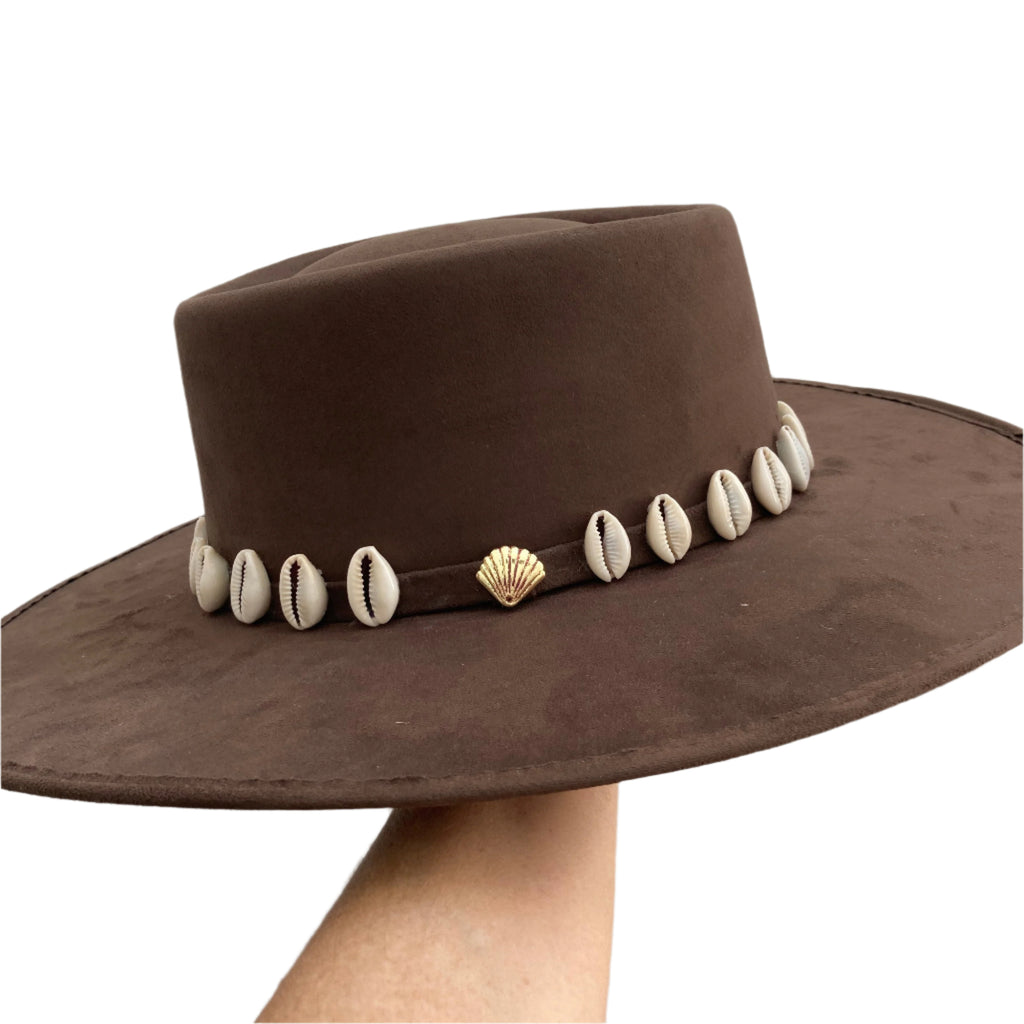 Cordovan-style hat in brown felt with a straight brim and a gold-plated plate. With a lightweight, elegant and waterproof design, this hat is the ideal accessory for any type of event. Made by Mexican hands and materials of the highest quality.