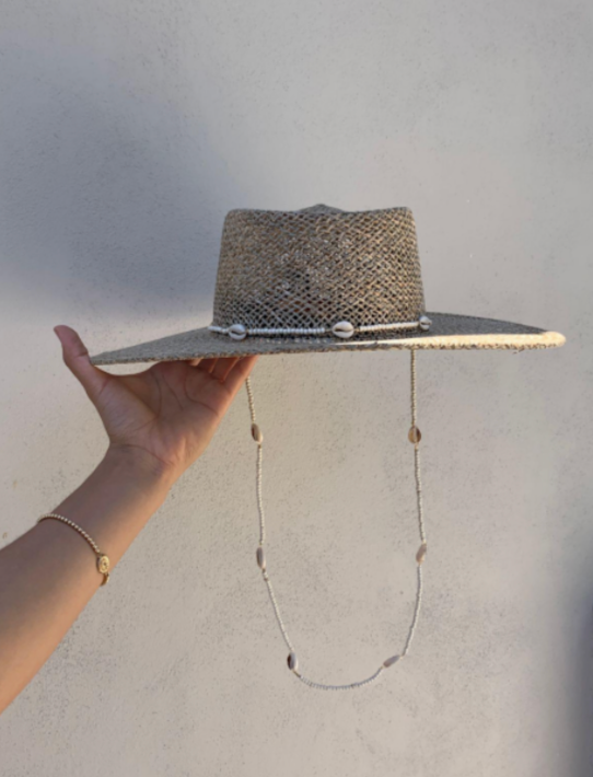 Cordoba-style hat made of seaweed material in a natural color with shell band and a removable white strap. The removable strap becomes the perfect accessory for your glasses. With a lightweight, elegant and waterproof design, this hat is the ideal accessory for any type of event. Made by Mexican hands and materials of the highest quality.