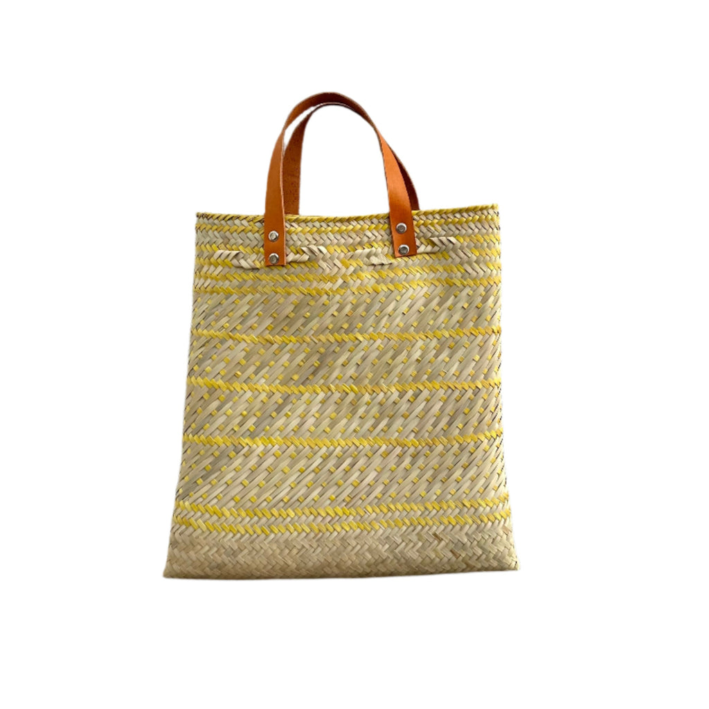 This chic straw bag features a sleek leather handle, blending natural texture with timeless sophistication—perfect for effortless, everyday elegance.