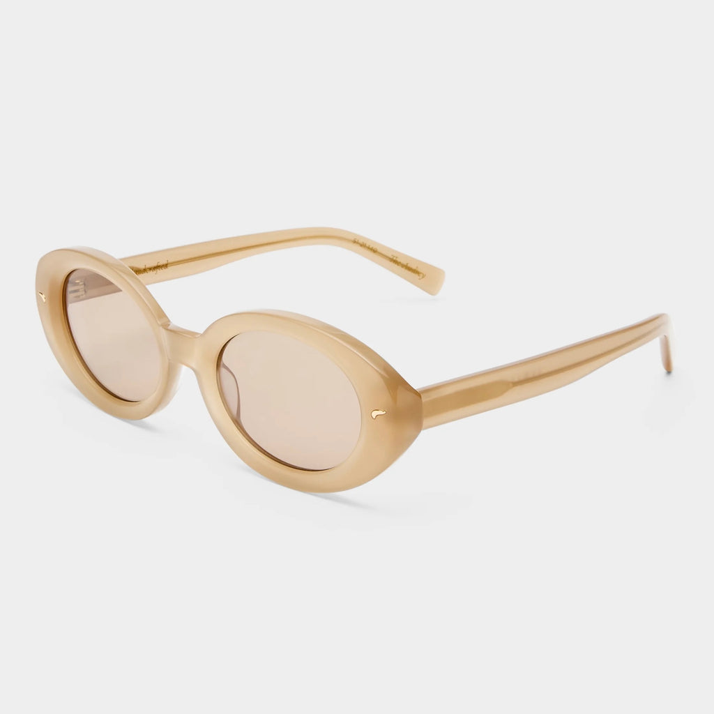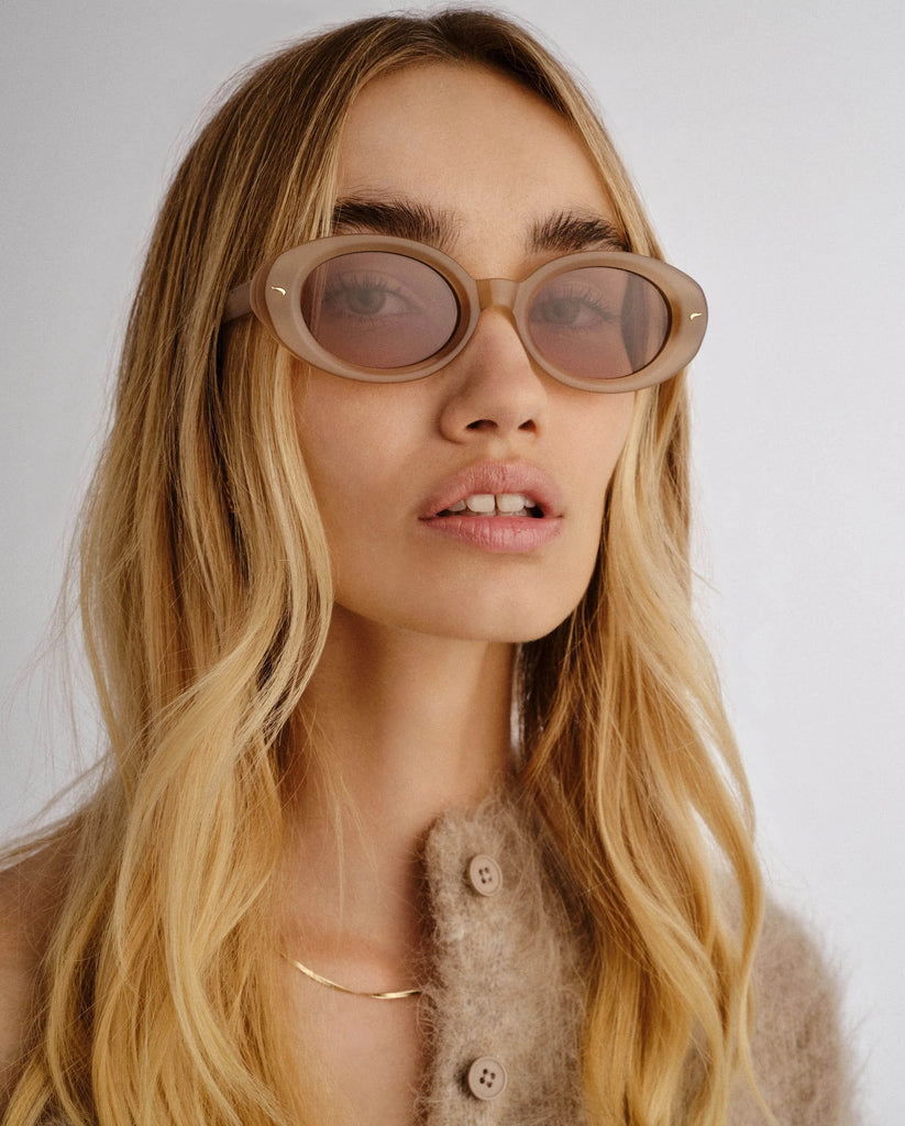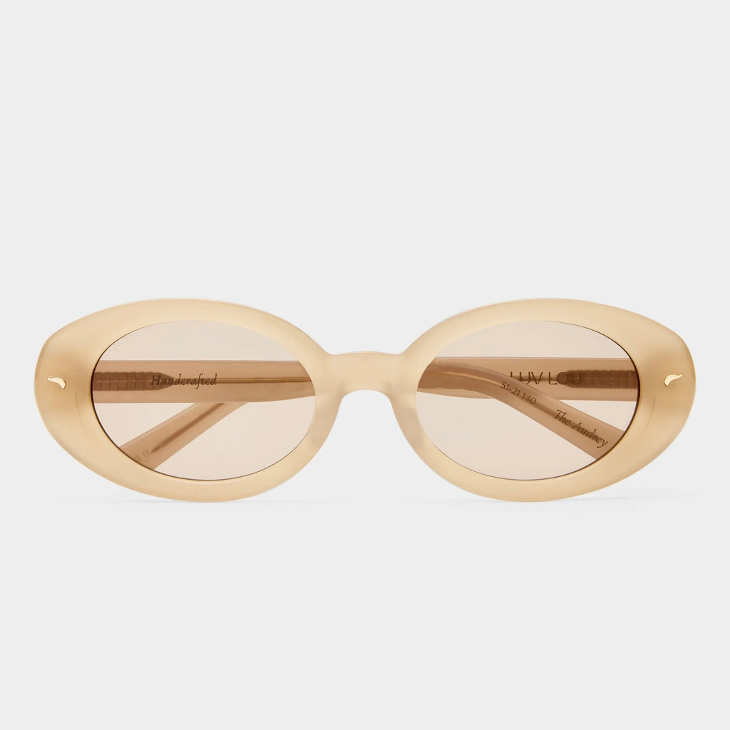 The Audrey is a medium-sized oval frame featuring fine acetate temples. This chic vintage meets modern frame perfectly flatters the face with its soft round edges and hints of gold hardware. Featuring our signature organic rivets on the front frame these sunglasses will make you feel elevated everyday. Finished in a premium frame with tint lenses. Handcrafted with premium gold wire core and hinges.