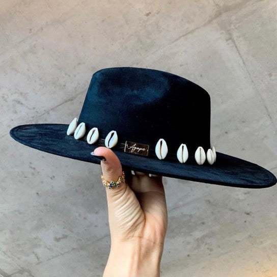 Cordovan-style hat in black felt with a straight brim, shell band, and a gold-plated plate. With a lightweight, elegant and waterproof design, this hat is the ideal accessory for any type of event. Made by Mexican hands and materials of the highest quality.