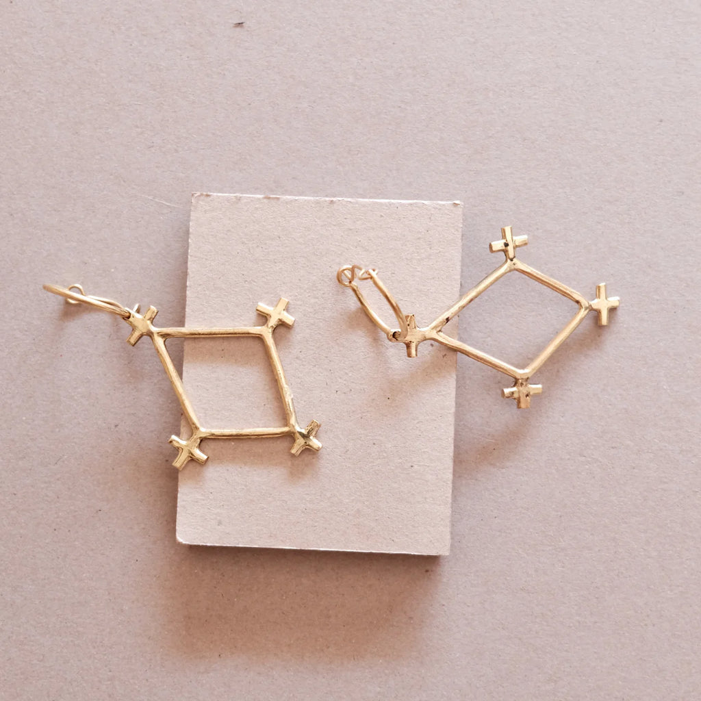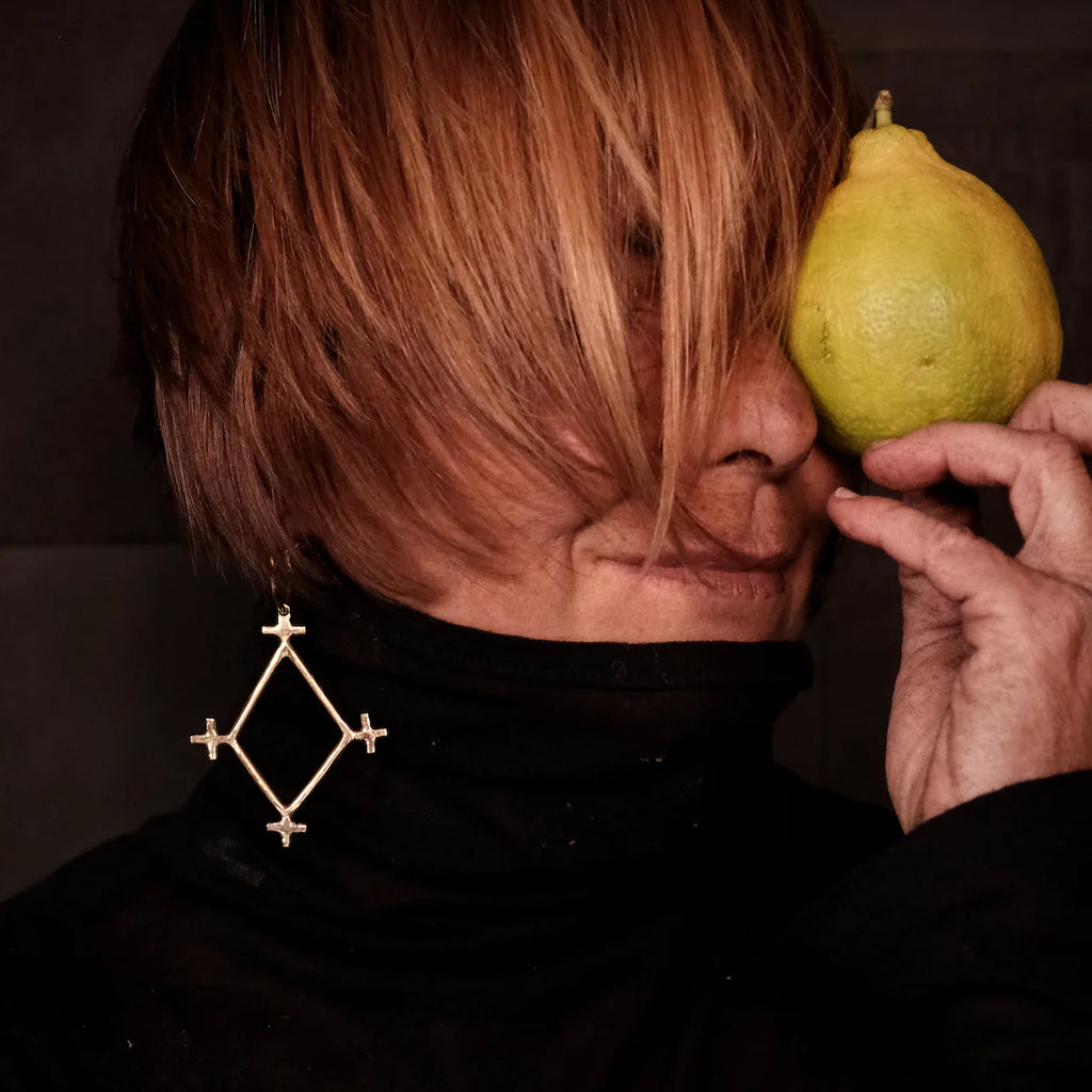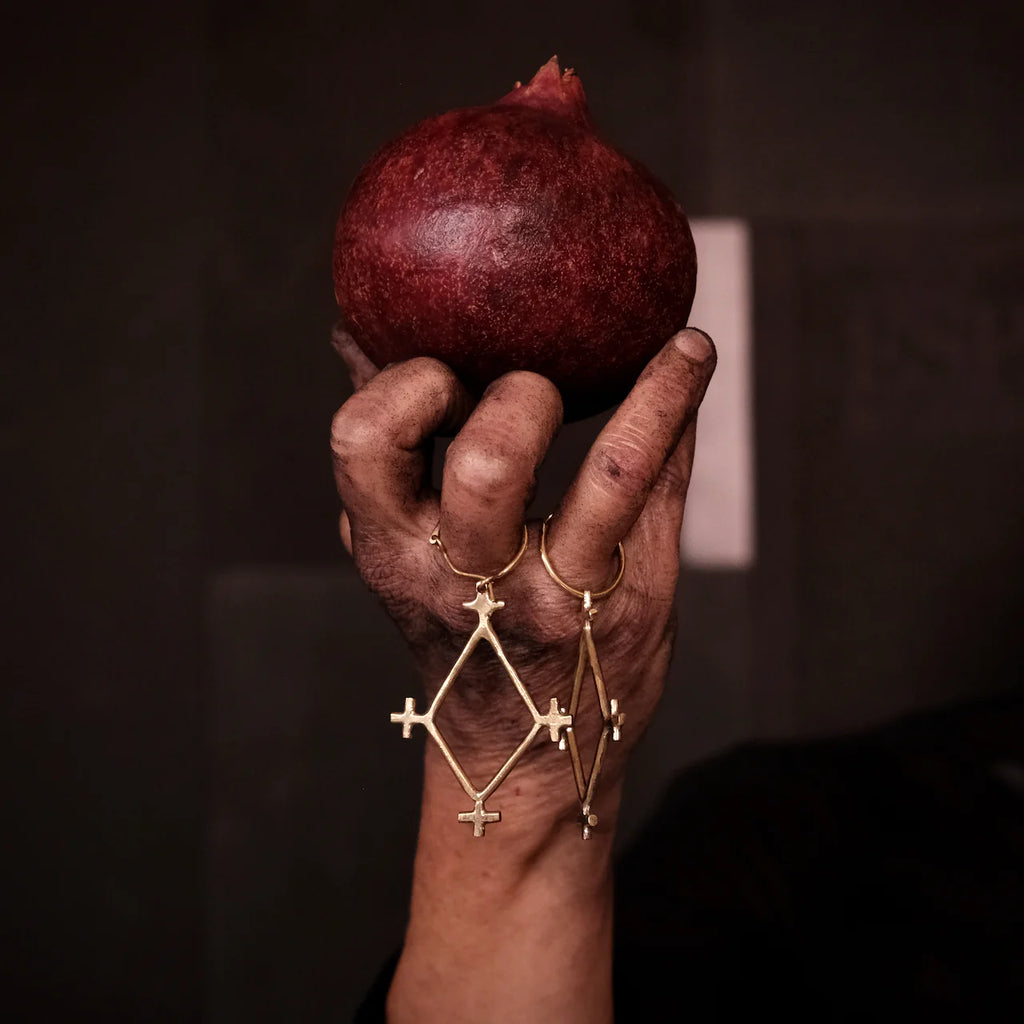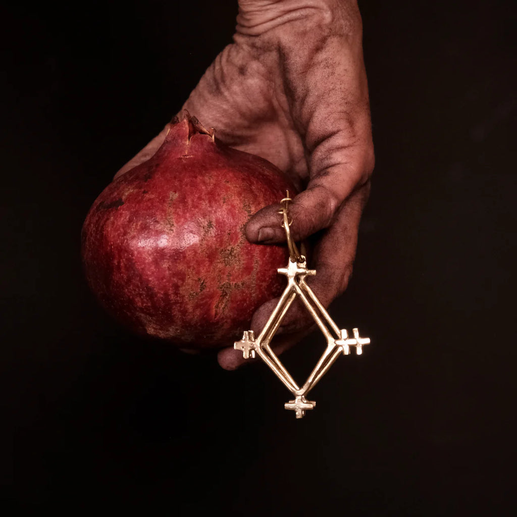 Make a bold but feminine statement with these diamond-shaped brass drop earrings, adorned with symbolic details. A brass ear hoop completes the look, creating a striking accessory for the modern woman. Handcrafted in Marrakech using traditional techniques, these earrings exude a sense of artistry and elegance.