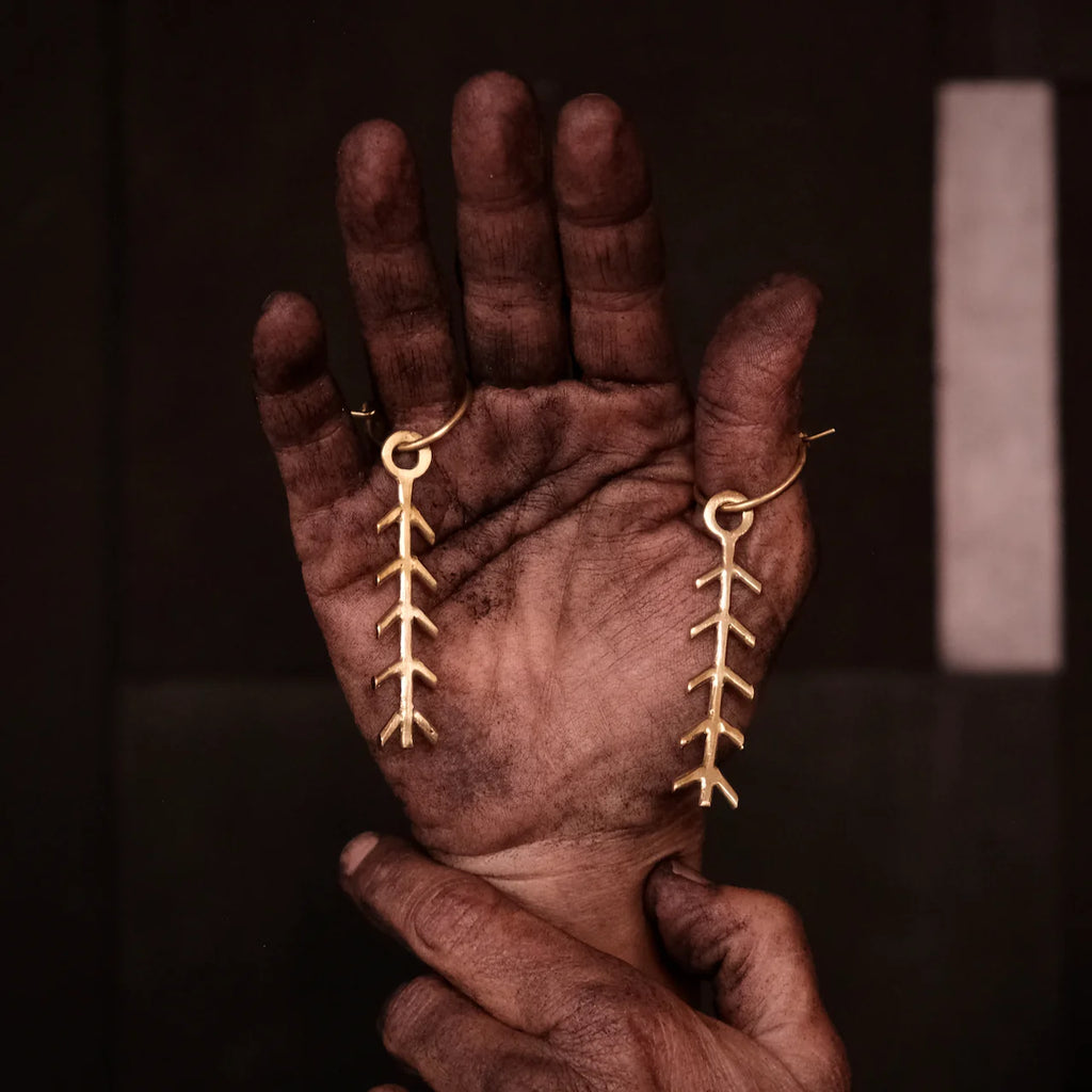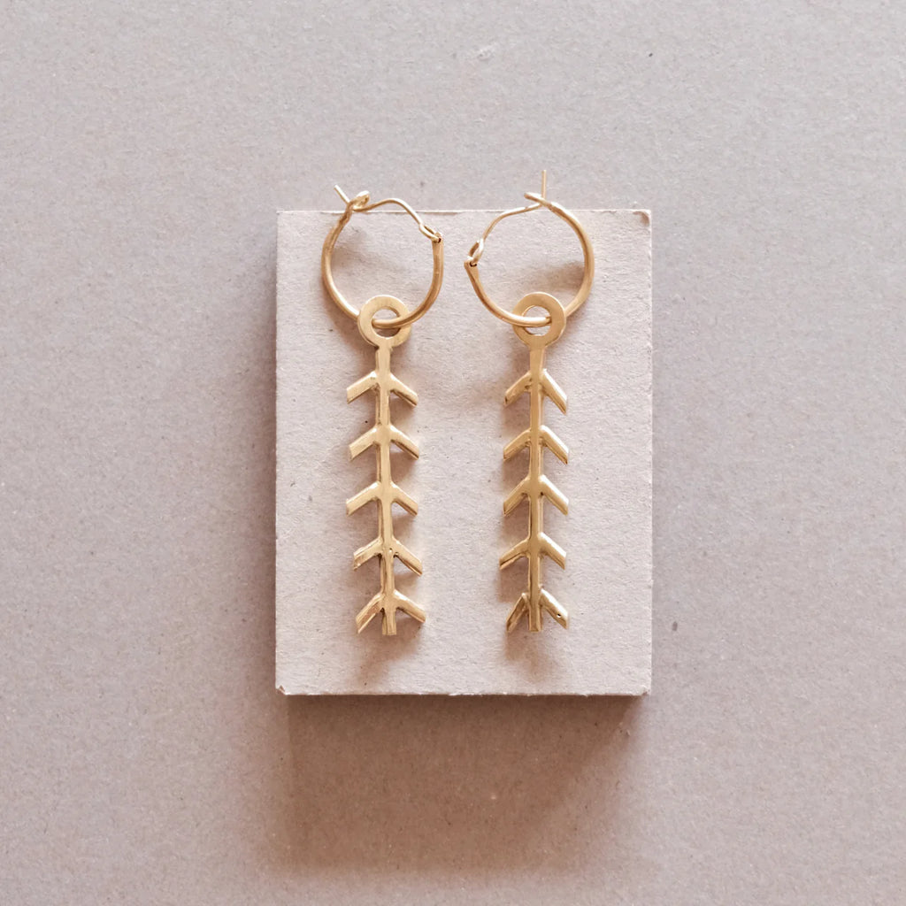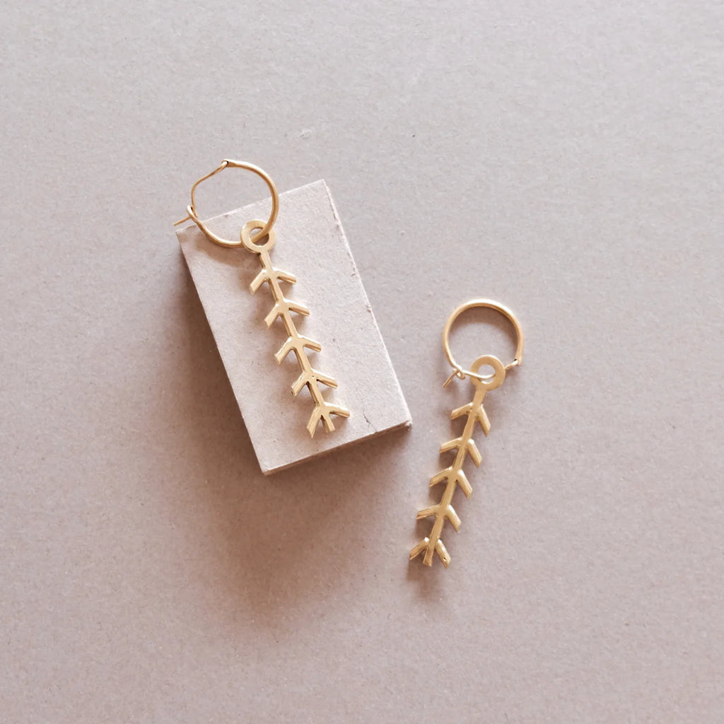 Beautifully handcrafted in Marrakech, these Amazigh inspired, fishbone-shaped earrings boast a unique design, exuding a sense of history and the exotic. The brass ear hoop adds the finishing touch to these eye-catching earrings.