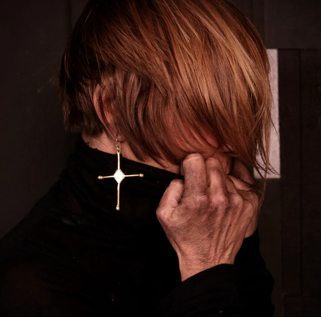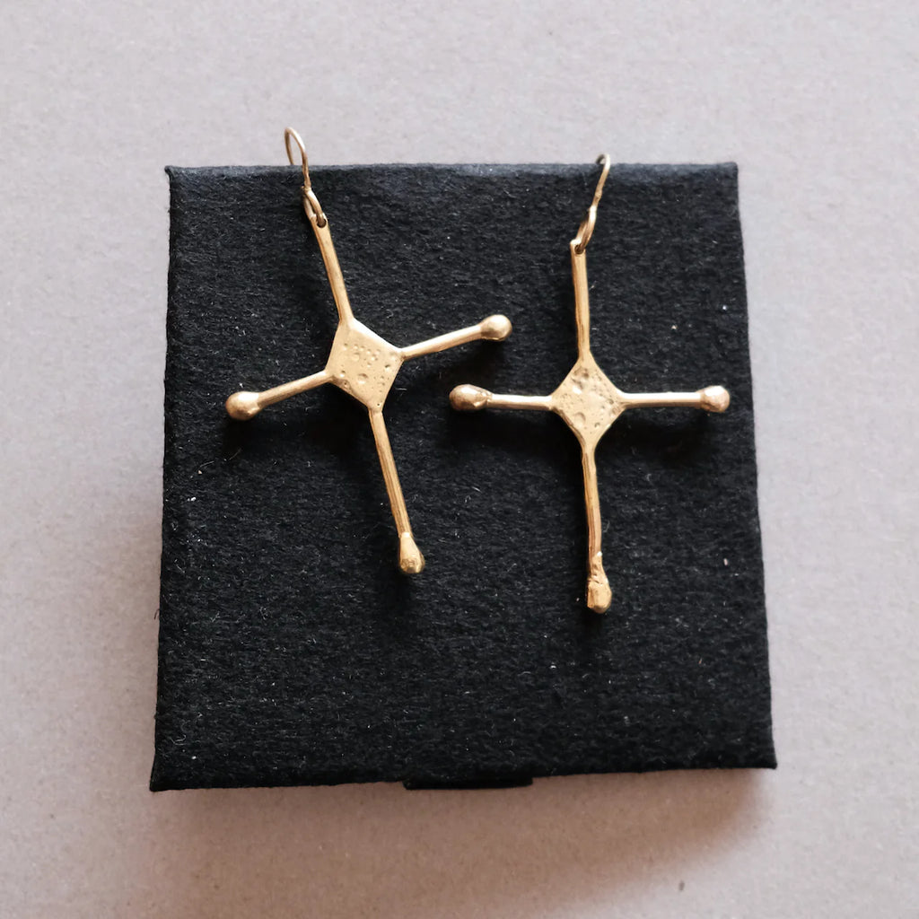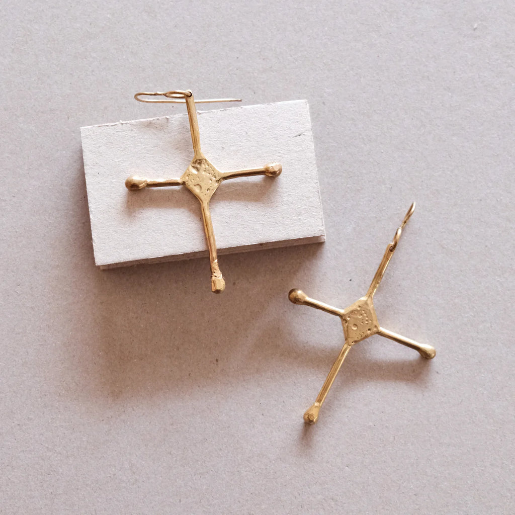 Enjoy the artistry of our Amazigh Solid Cross Earrings, featuring a molten brass diamond center with orb accented ends, in a distinctive cross shape, and finished with brass ear hooks. This simple design perfectly complements other pieces in our Amazigh Cross collection - handcrafted by artisans in Marrakech.