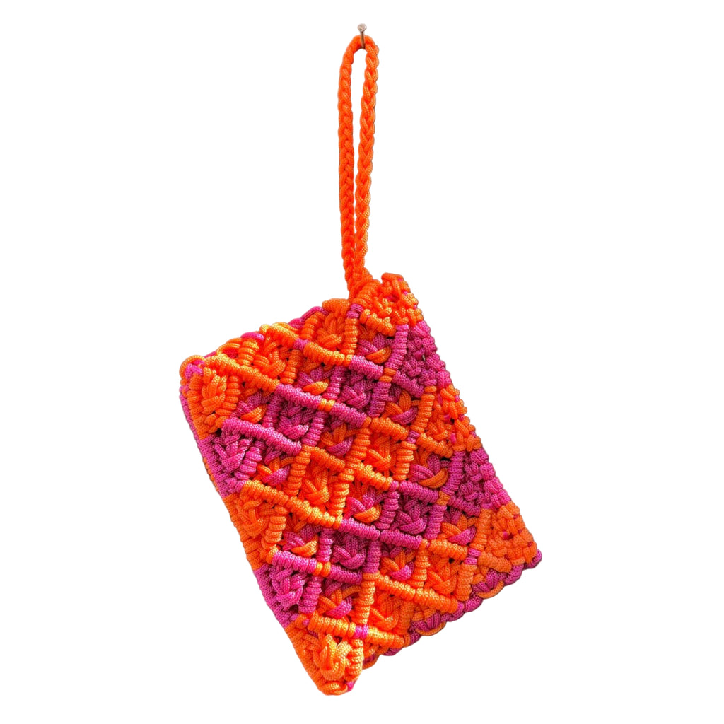 Hand-crocheted in Marrakech, this vibrant hot pink and orange clutch captures the glow of a desert sunset. Light, flexible, and effortlessly chic — perfect for sunset cocktails.