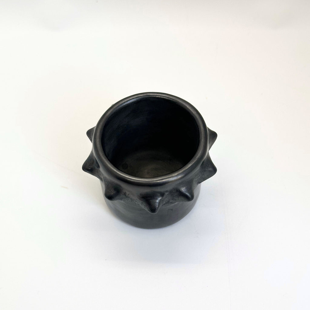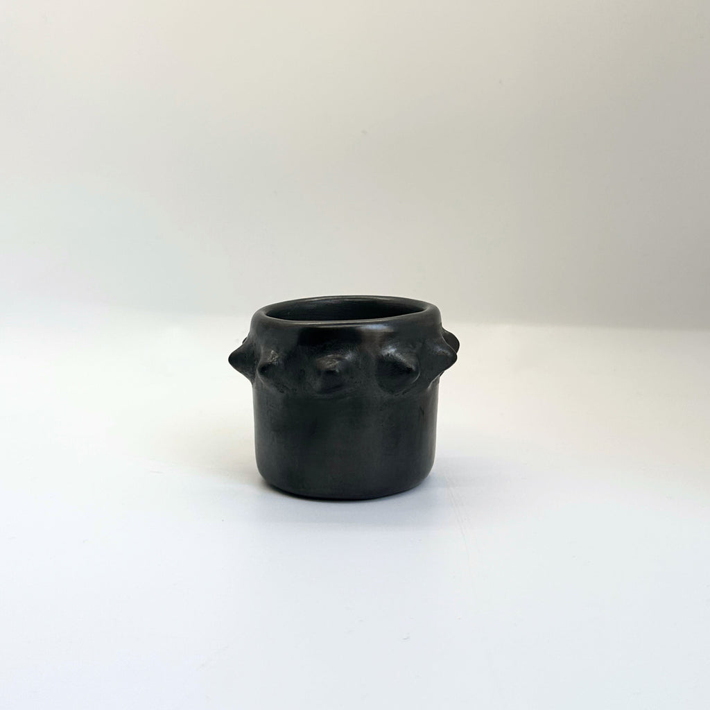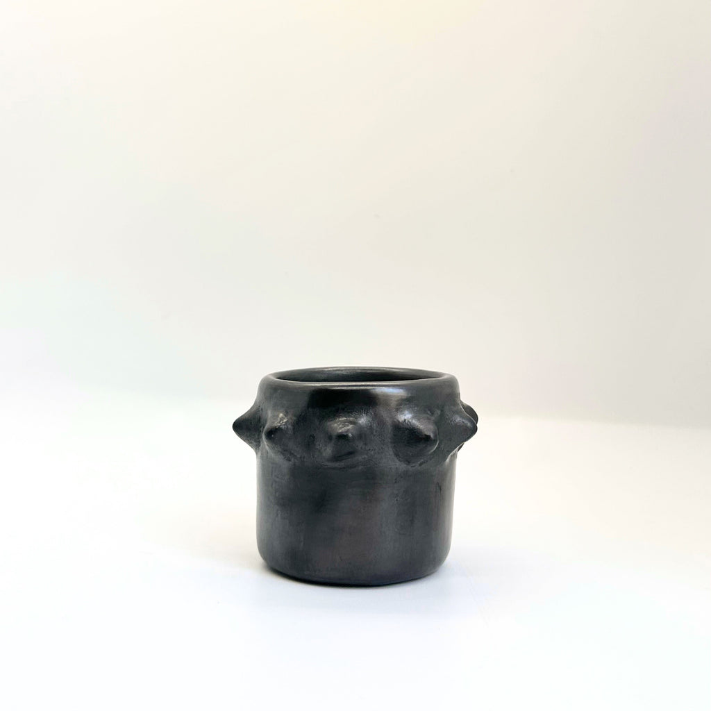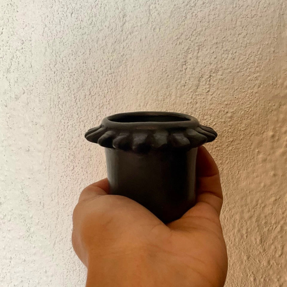 Striking and unique black clay mezcaleros handcrafted in Oaxaca, México featuring a pre-hispanic design.