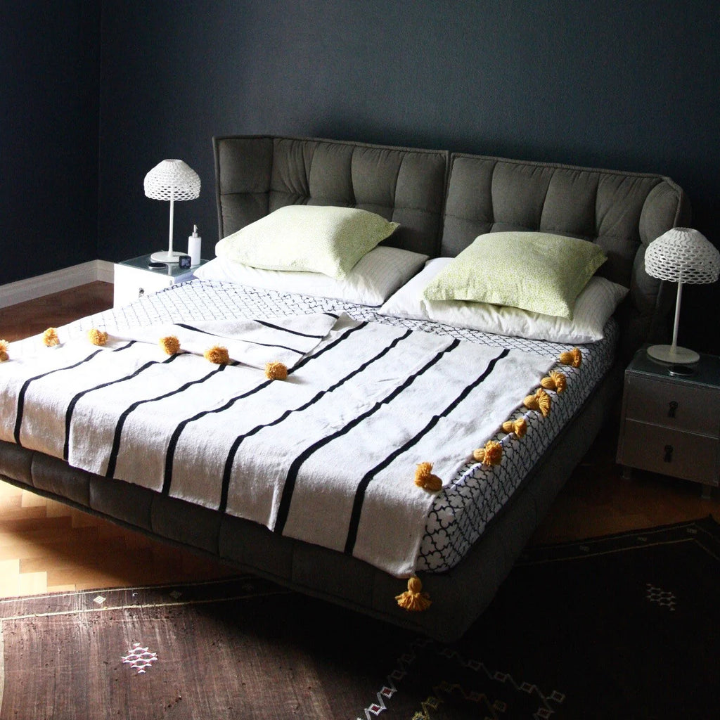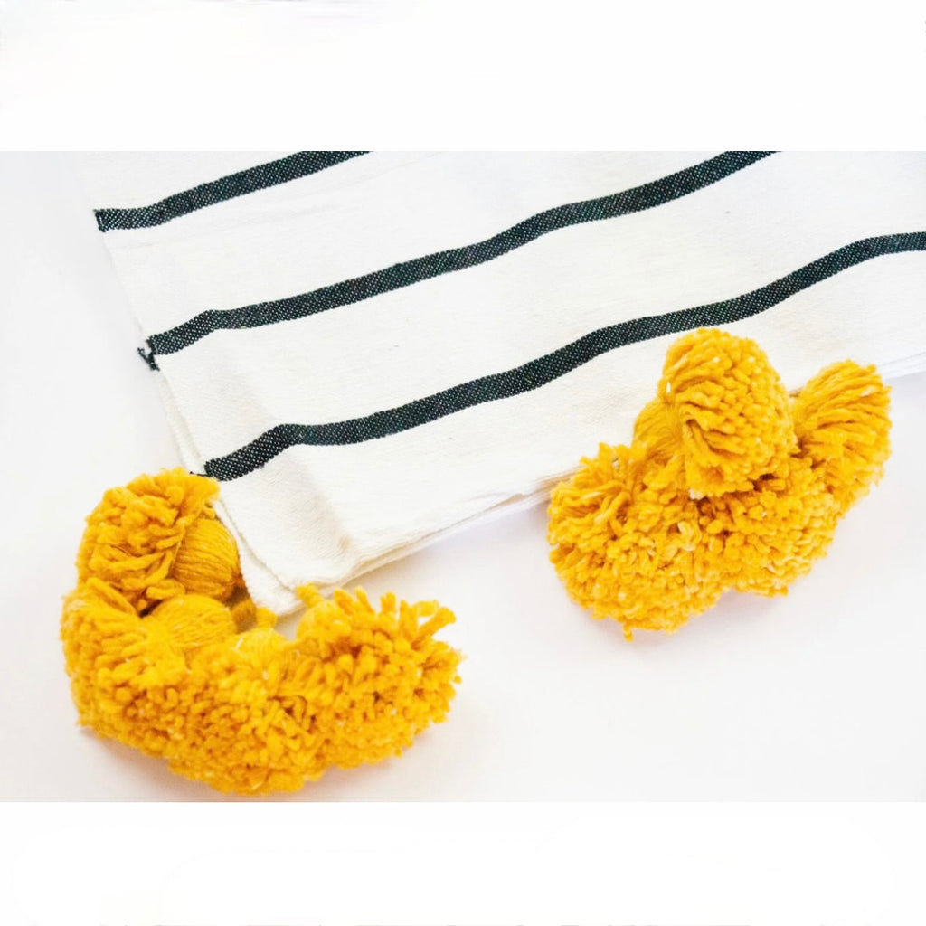 Iris Blanket | White/Black w/ Saffron Poms