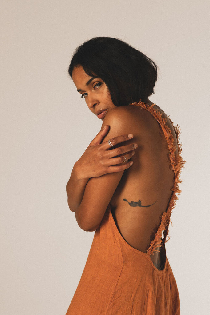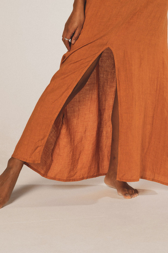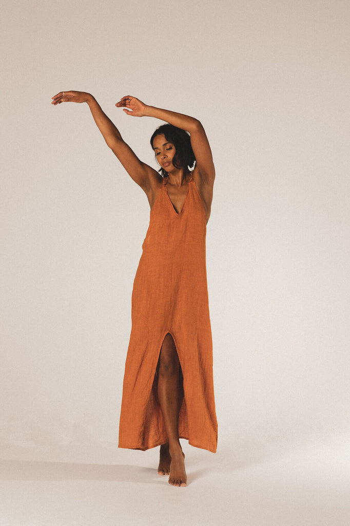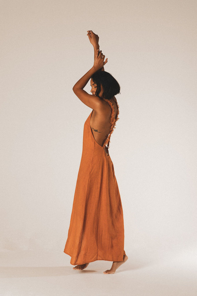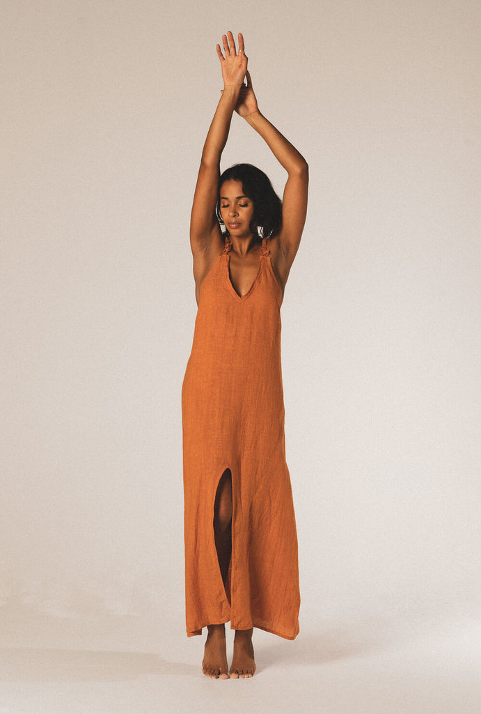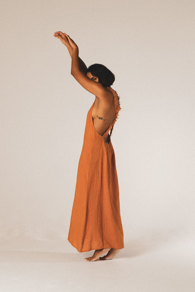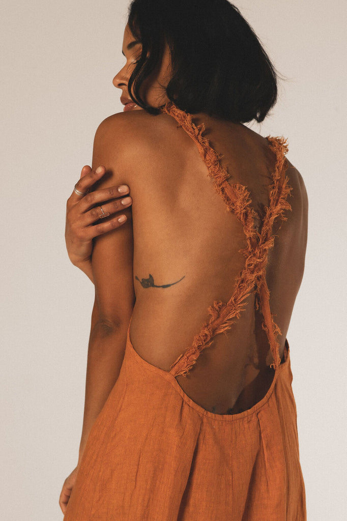 Our signature bora bora is an escape into a raw linen romance. A plunging neckline, front split and ultra low back with raw feather frayed straps. crafted in soft textured linen. A sensual style, minimal yet breathtaking.