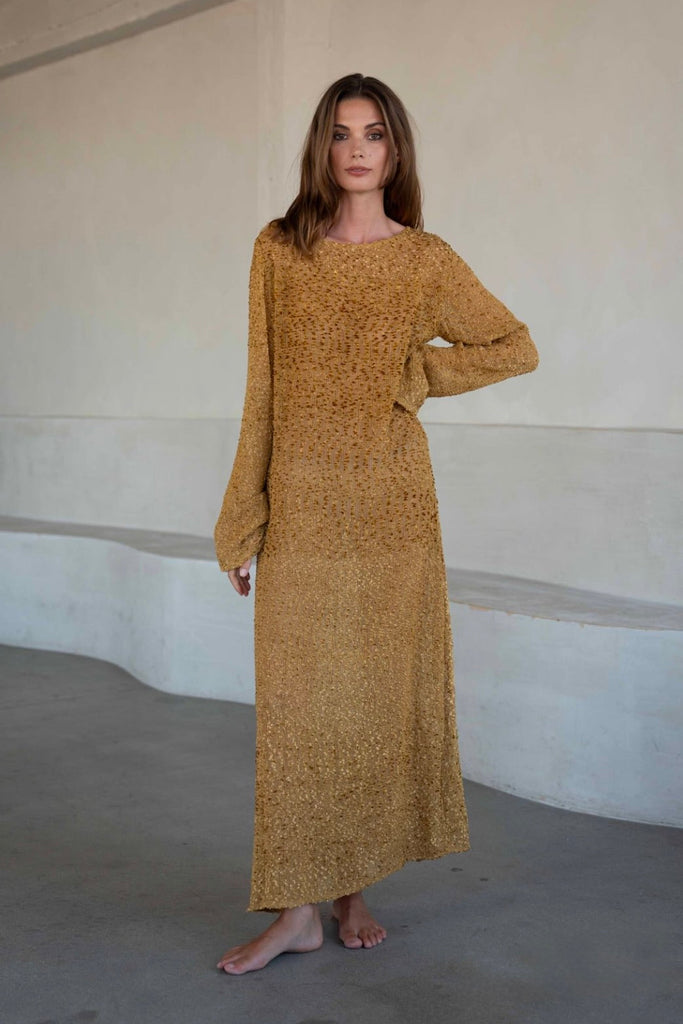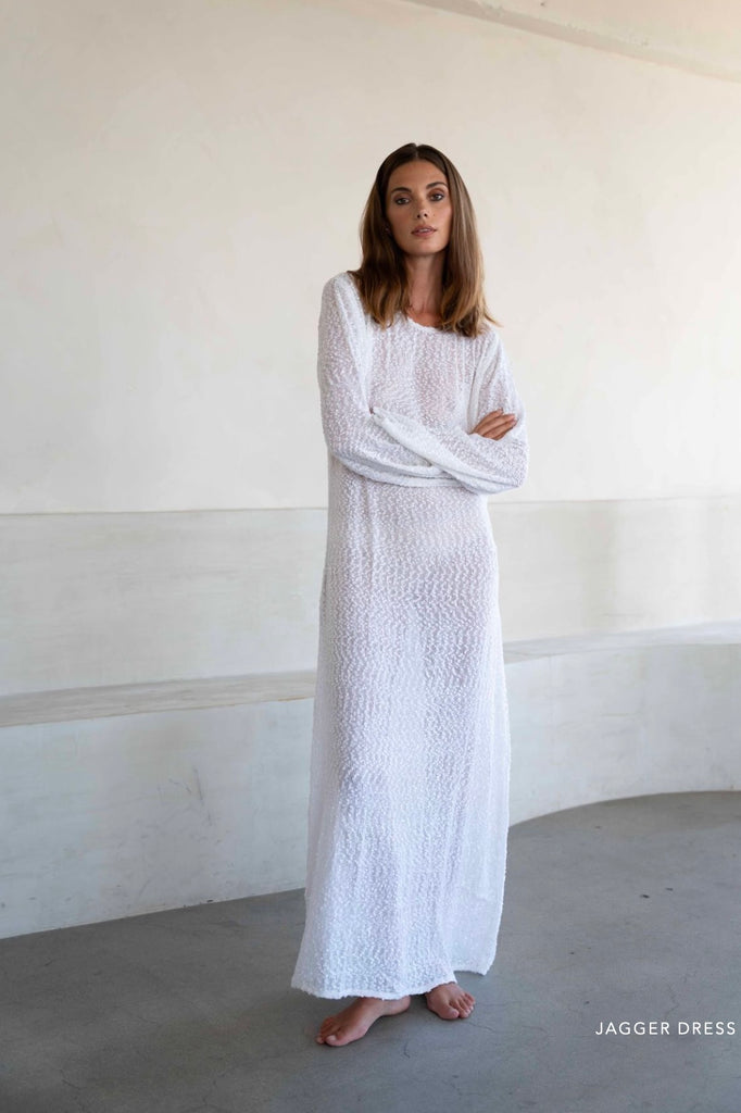 The Jagger dress is crafted from a uniquely textured, semi sheer knitted cotton. Evoking the feeling of summer, to be worn simply as a coverup or dress with a pair of sandals or bare feet.