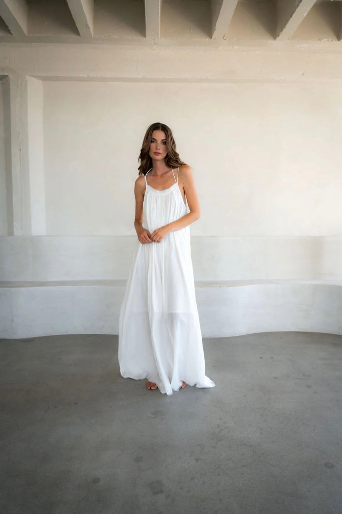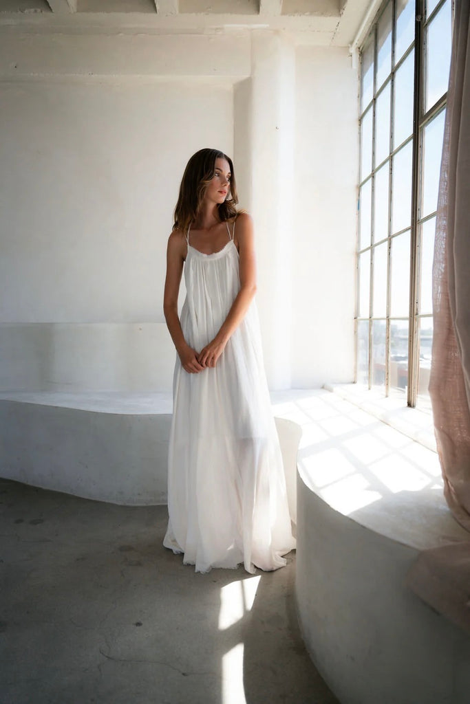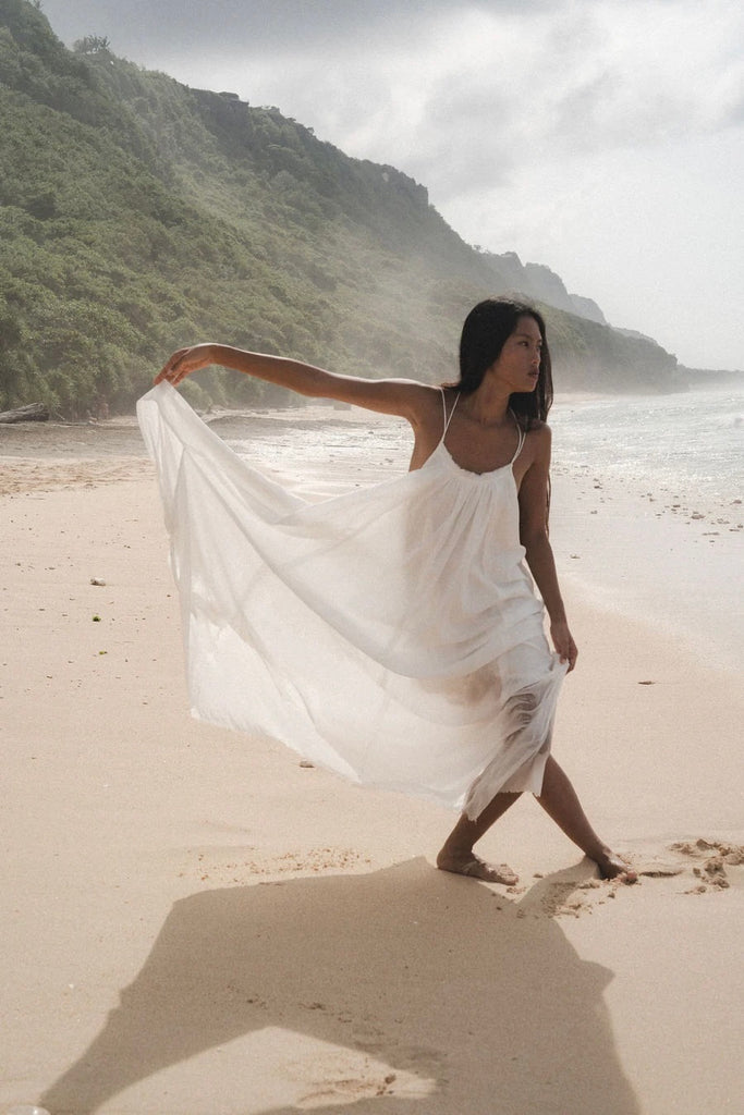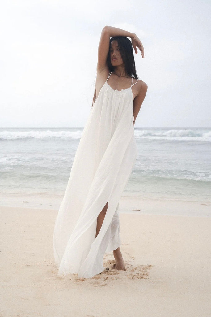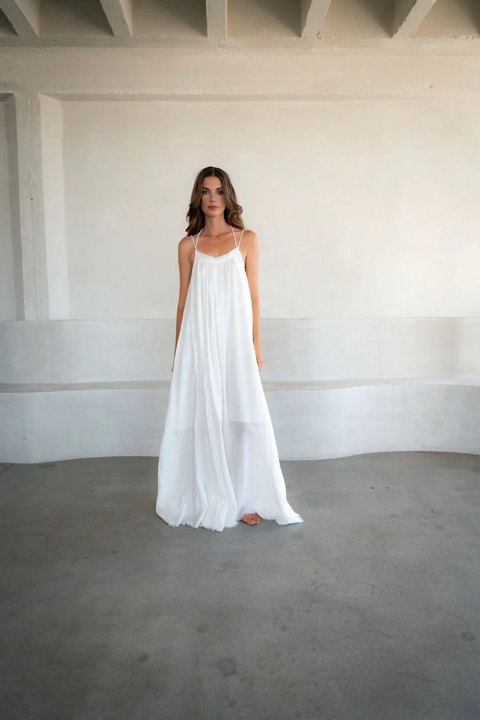 The Peponi dress features flowing swathes of feather light organic cotton. A mini inner slip allows coverage while the floor length skirt boasts a semi sheer allure. A raw scooped neckline meets double strap feature which cascades down the back. Where bohemian spirit meets minimal elegance.