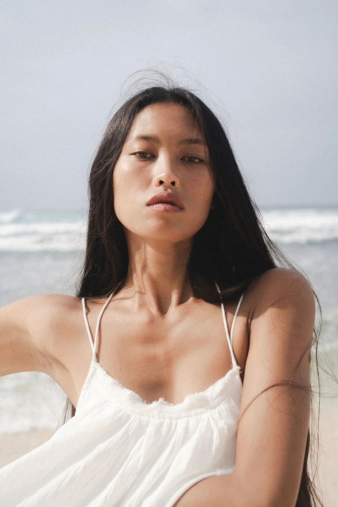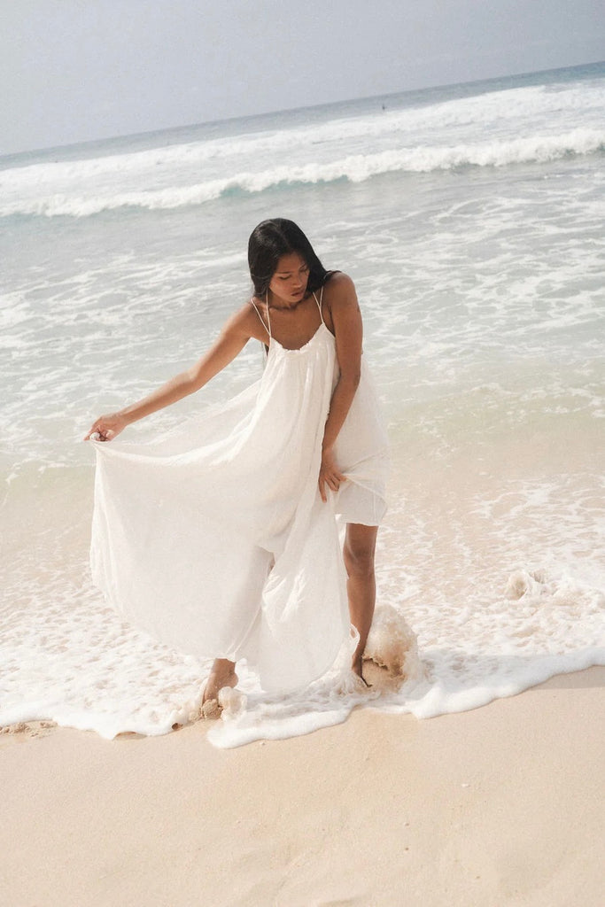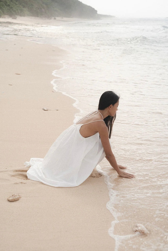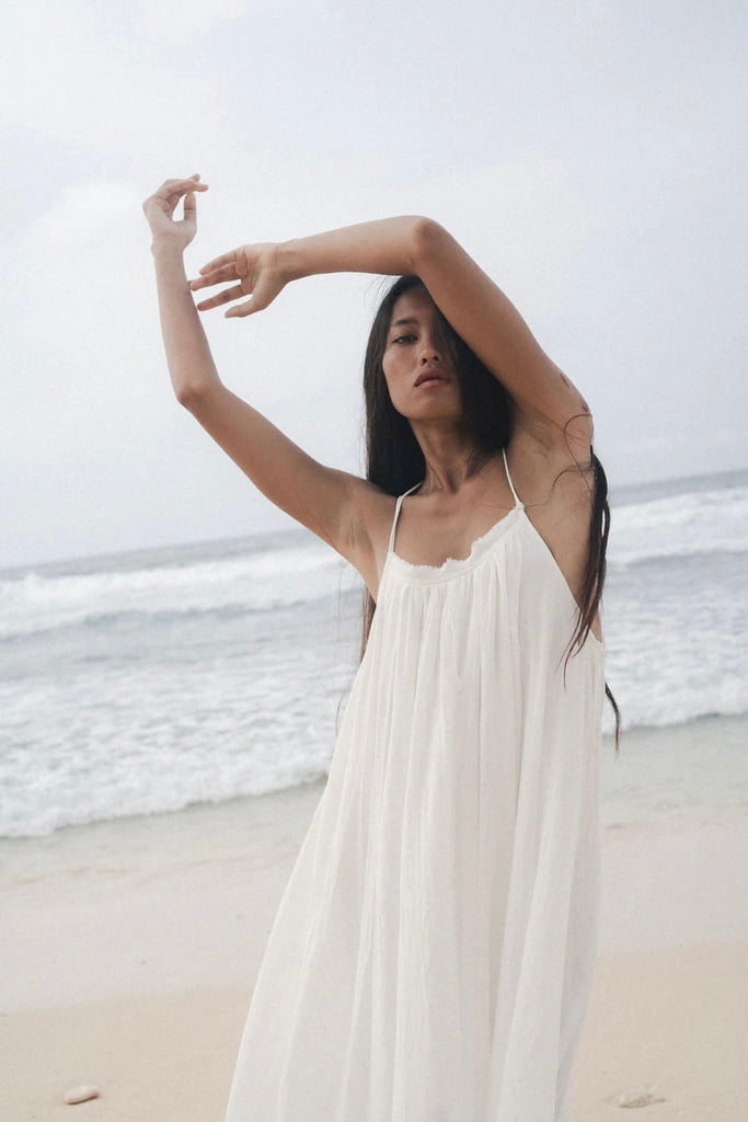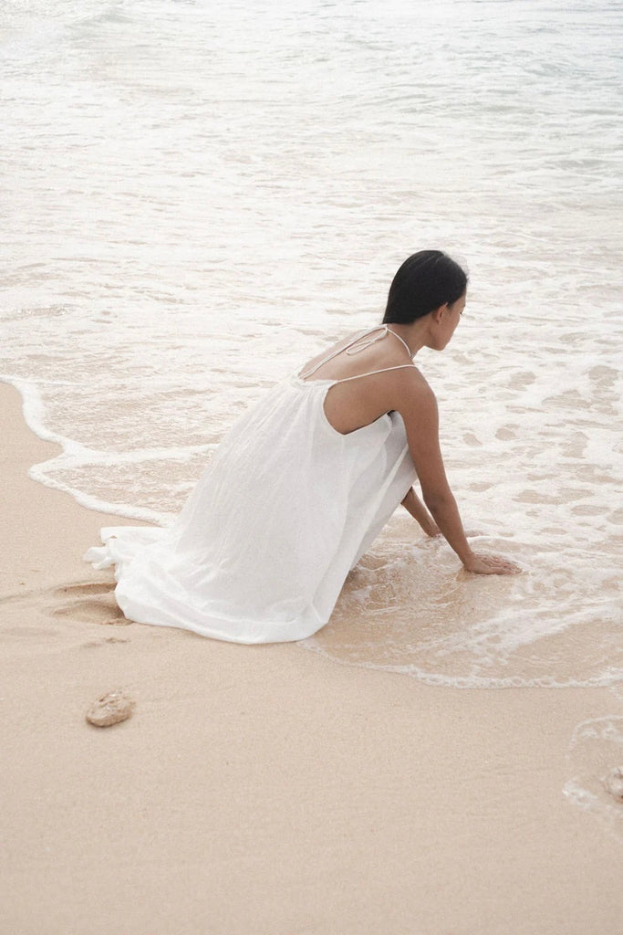 The Peponi dress features flowing swathes of feather light organic cotton. A mini inner slip allows coverage while the floor length skirt boasts a semi sheer allure. A raw scooped neckline meets double strap feature which cascades down the back. Where bohemian spirit meets minimal elegance.