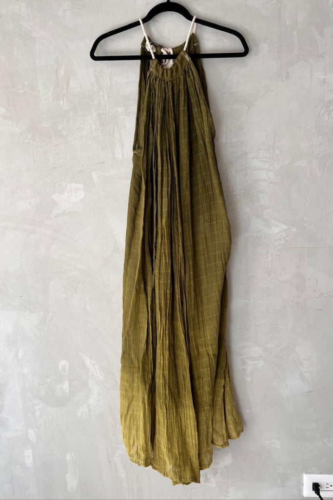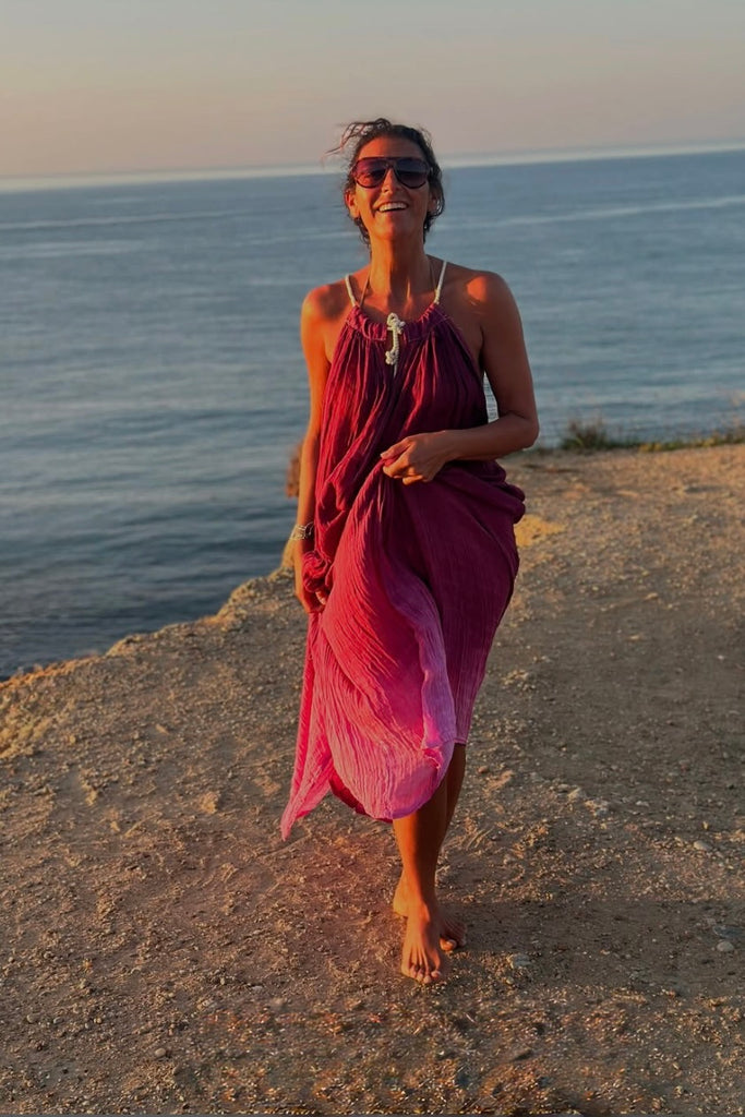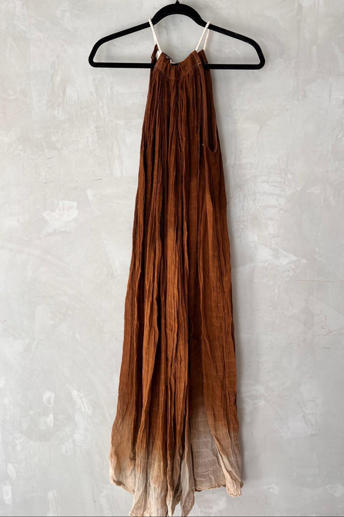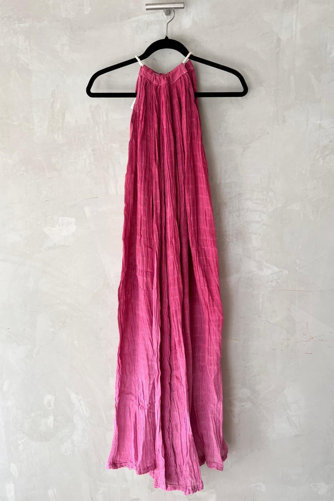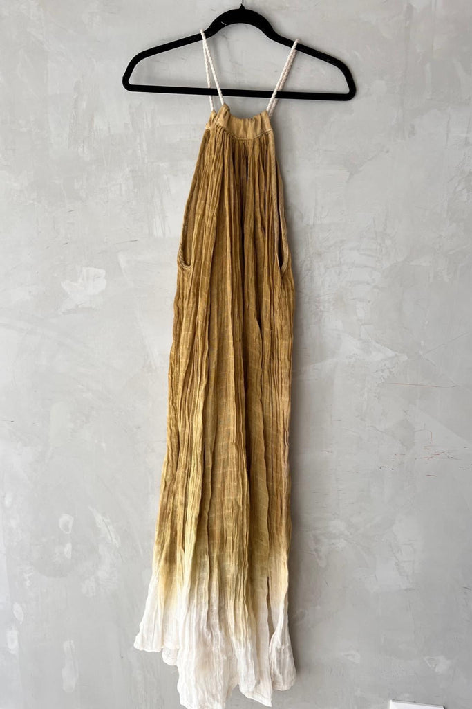 A breezy gauze halter dress handwoven in Mexico, perfect for warm days and effortless evenings. Its lightweight flow and artisanal charm make it a staple for beach strolls or summer soirées.