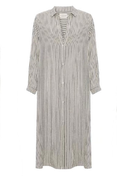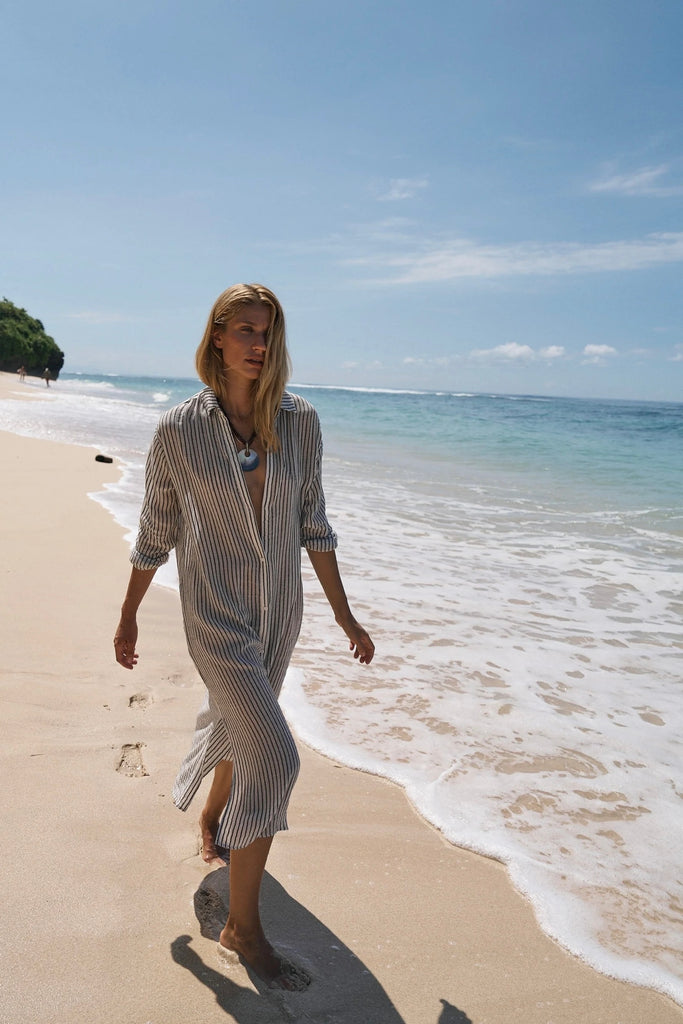 Terra Shirt Dress, is the trans-seasonal statement your wardrobe’s been waiting for which brings classic shirting to the coast with a relaxed body and soft billow through the sleeves with semi sheer light cotton, with an airy flow. A pearl shell button-down front and soft collarless style elevates the look for beach to dinner versatility.