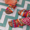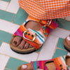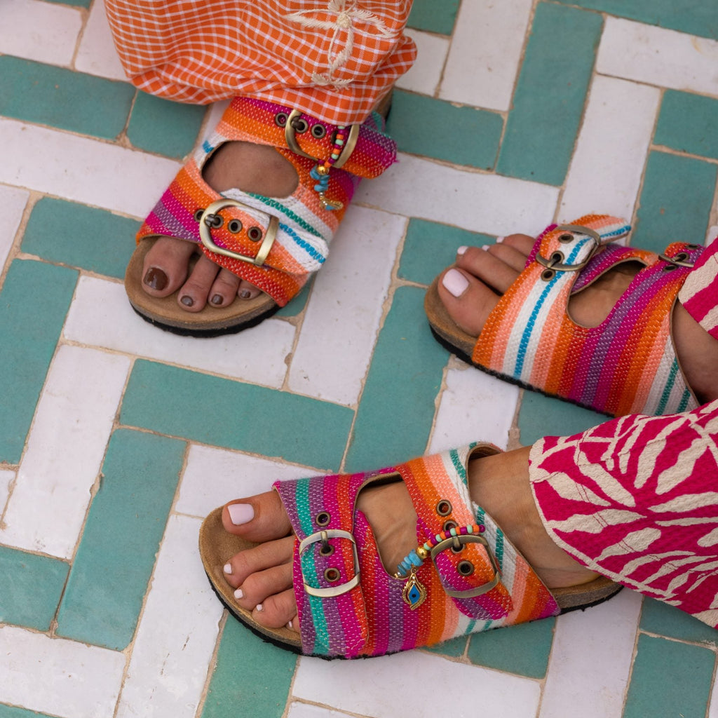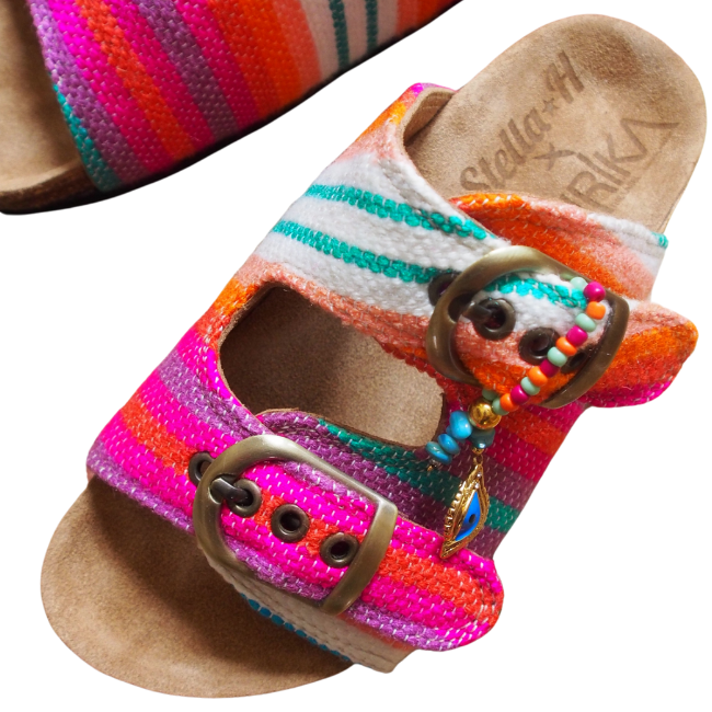 A playful mix of colorful tones, HAIK fabrics, and vibrant energy — made to brighten your summer days and wrap you in love from head to toe. High quality and light sole. Suede upper and footbed lining helps keep you comfortable. Two adjustable straps with metal pin bluckles. All sandals are provided with a dustbag and a unique tag inside.