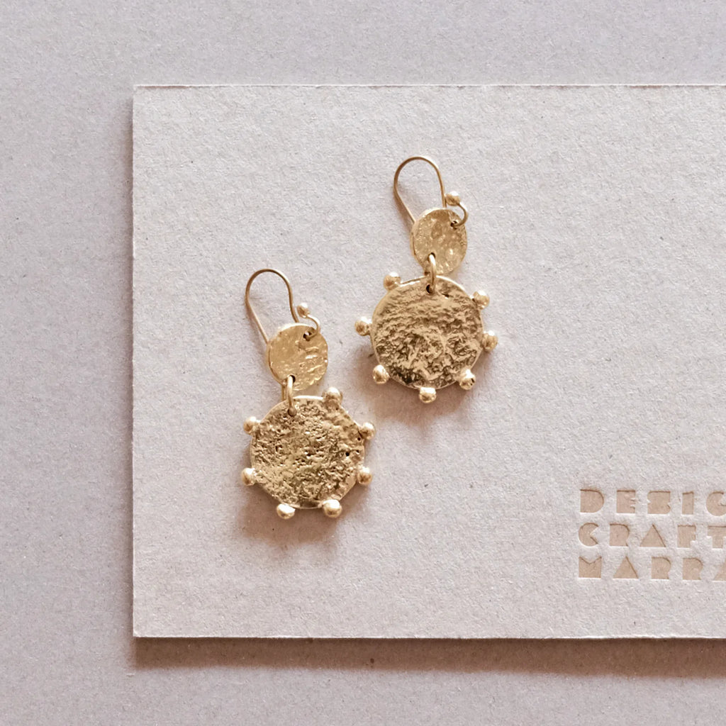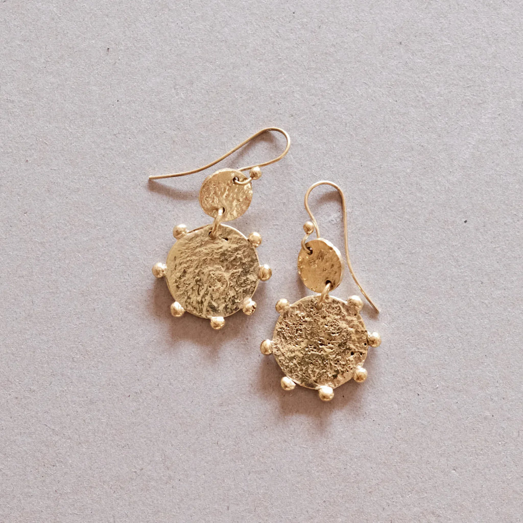 The Hebba Double Disc earrings bring character to your look with molten brass discs and signature raised dot detailing. Inspired by Berber design, the Hebba collection stands out for its distinctive texture. Each piece is traditionally handcrafted from solid brass, offering a refined, modern edge. Effortlessly pairs with other styles in the Hebba story for a cohesive, statement-making ensemble. Meticulously handcrafted by artisans in Marrakech.