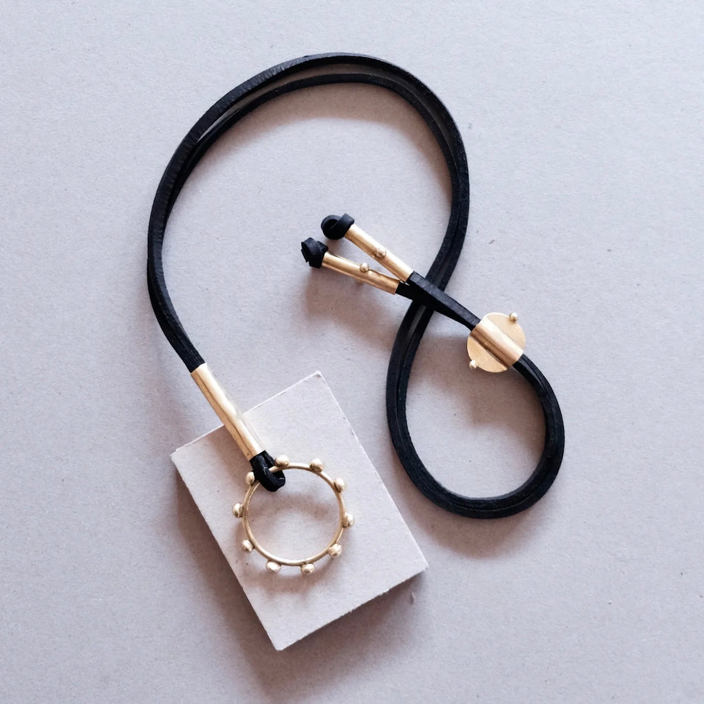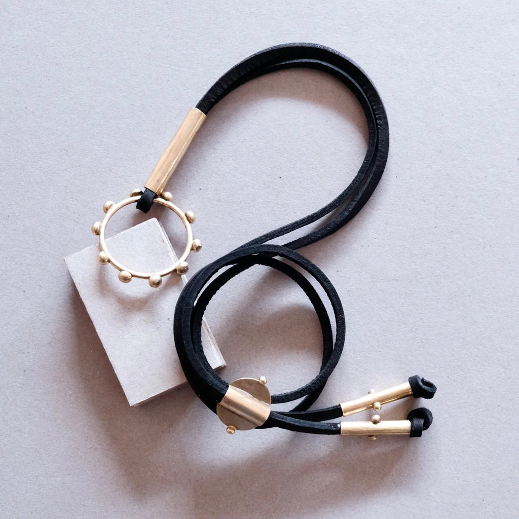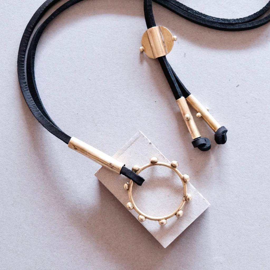 Distinctive Berber inspired contemporary jewellery collection defined by the raised dots that feature on each piece. Each piece is handcrafted the traditional artisan way from recycled brass and the necklaces feature soft premium leather neckbands in cognac, black or sand.