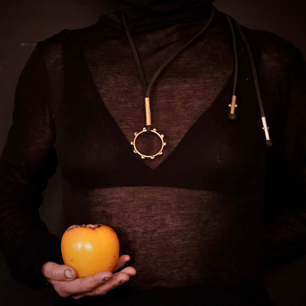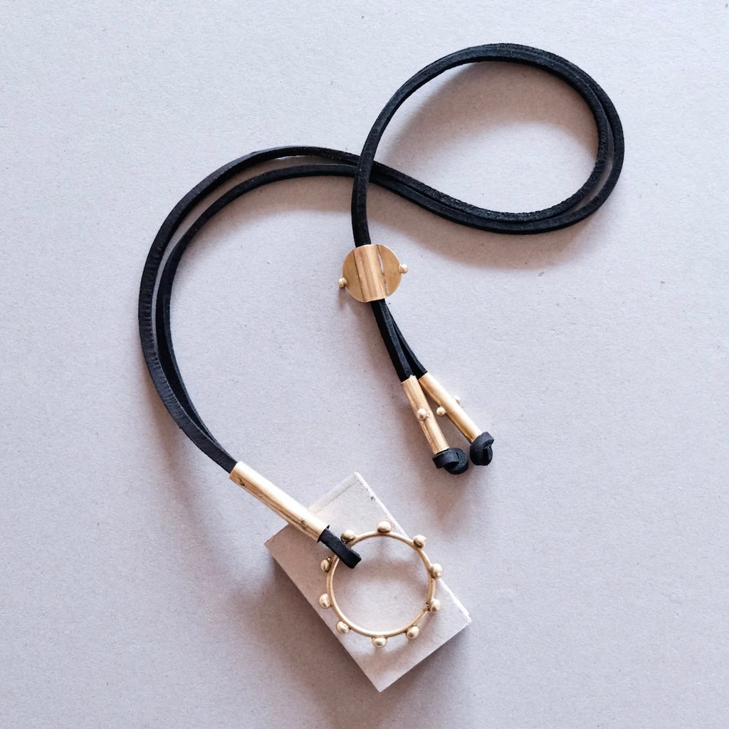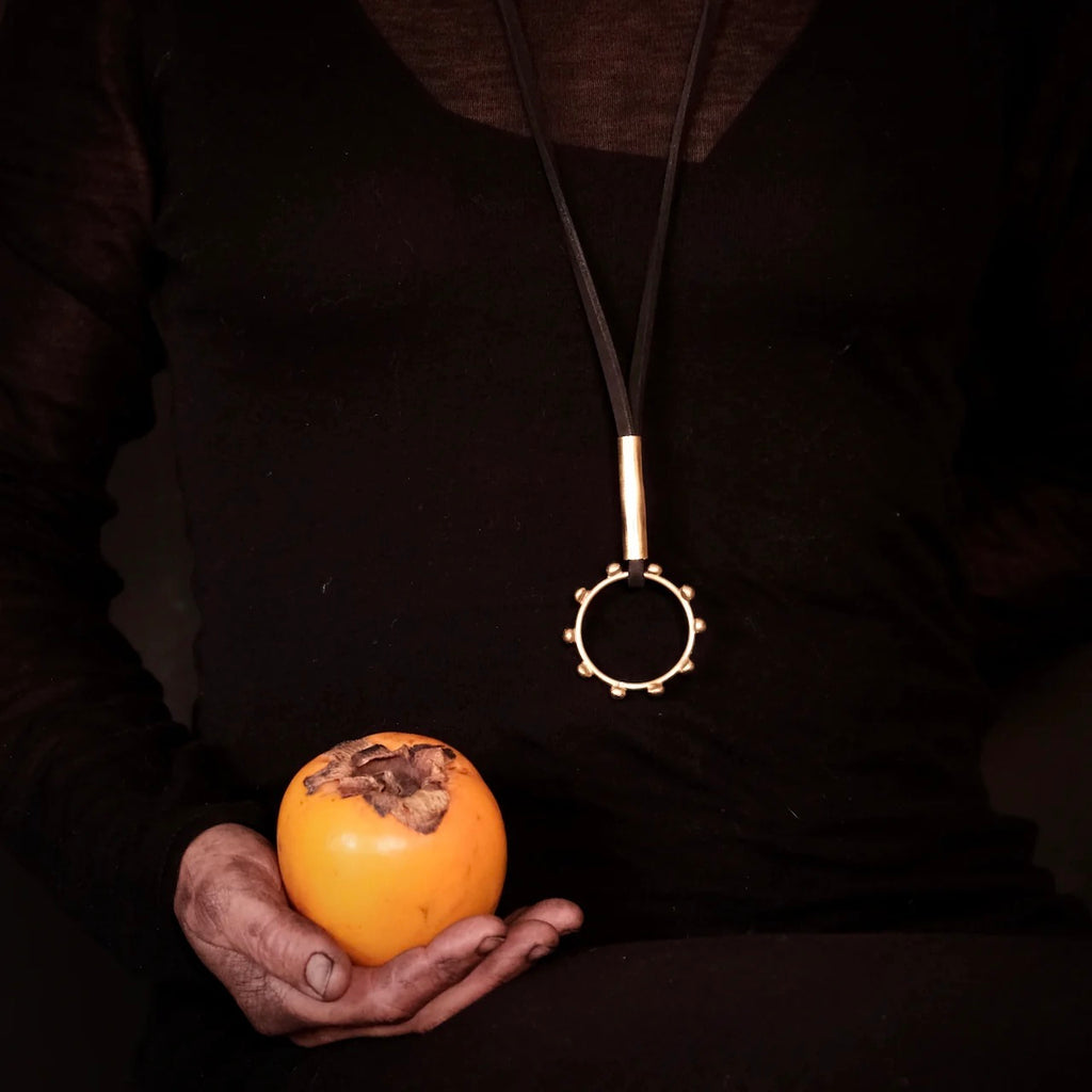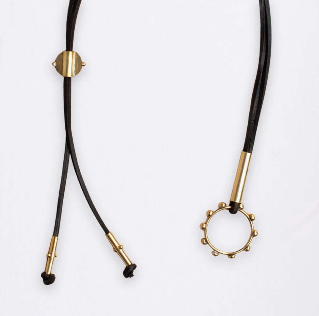 Distinctive Berber inspired contemporary jewellery collection defined by the raised dots that feature on each piece. Each piece is handcrafted the traditional artisan way from recycled brass and the necklaces feature soft premium leather neckbands in cognac, black or sand.