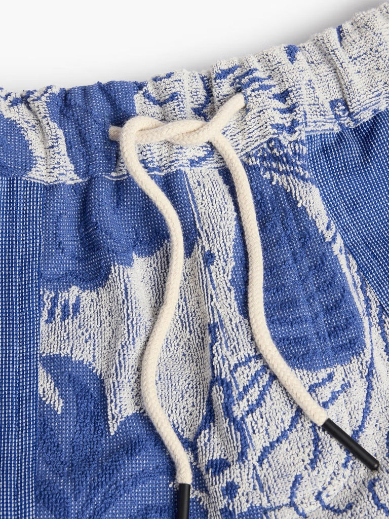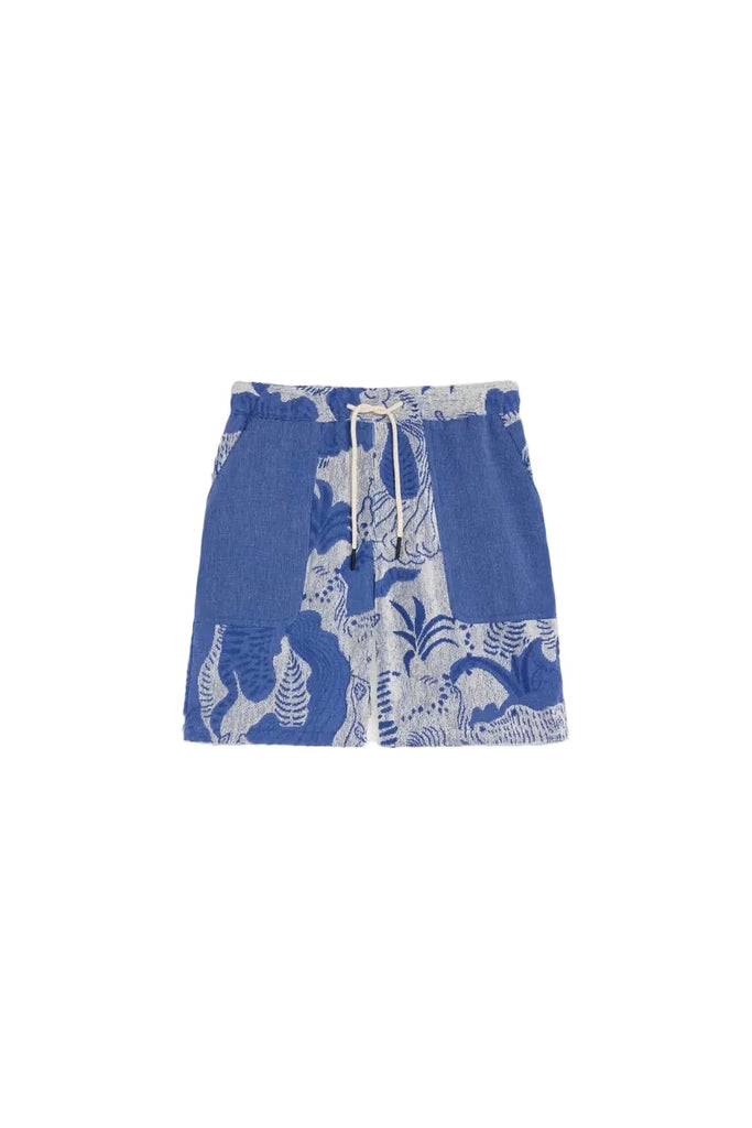 The Mystea Nicola are blue shorts in heavyweight jacquard-woven terry with ocean-inspired pattern. Breathable cotton with soft texture. Elastic waist, side pockets, and one back pocket. Regular fit with mid-rise and longer legs.