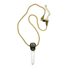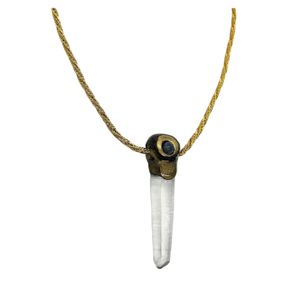 Materials: Hand sculpted epoxy, gold leaf, gold dust, resin, Brazilian quartz, blue moonstone from Sri Lanka, vintage nickel-free brass chain.