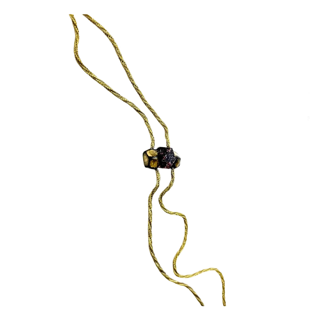 • Materials: Hand sculpted epoxy, gold leaf, resin, garnet from Mali, vintage nickel-free brass chain.