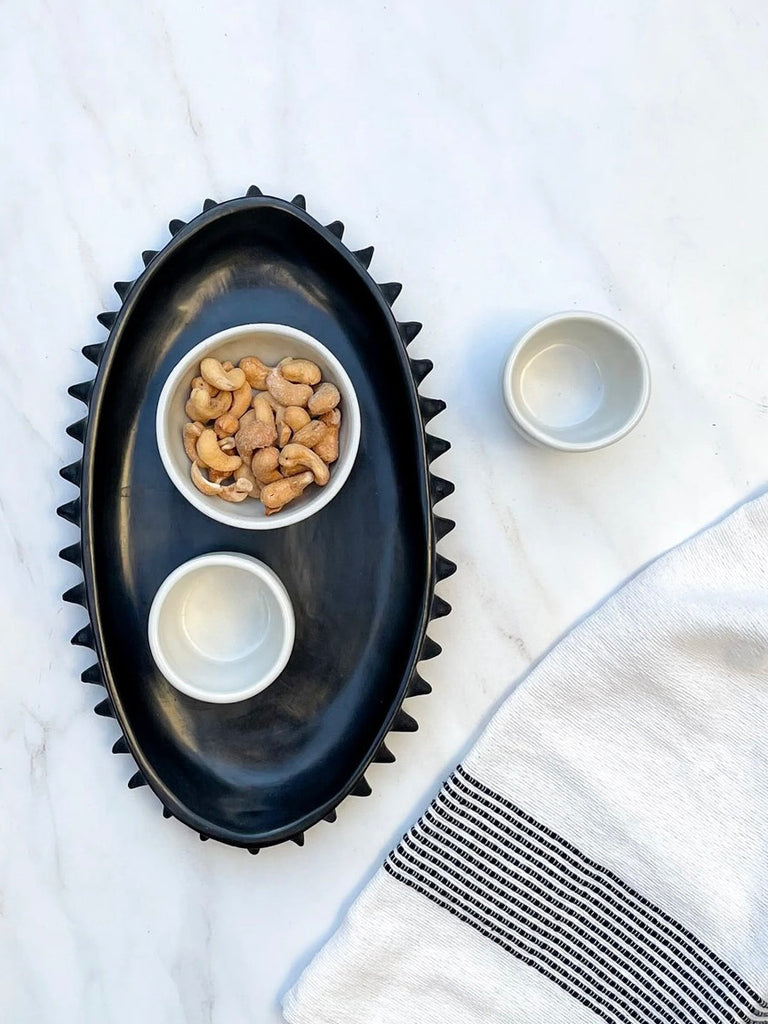 Striking and unique black clay bowls handcrafted in Oaxaca, México featuring a pre-hispanic design.