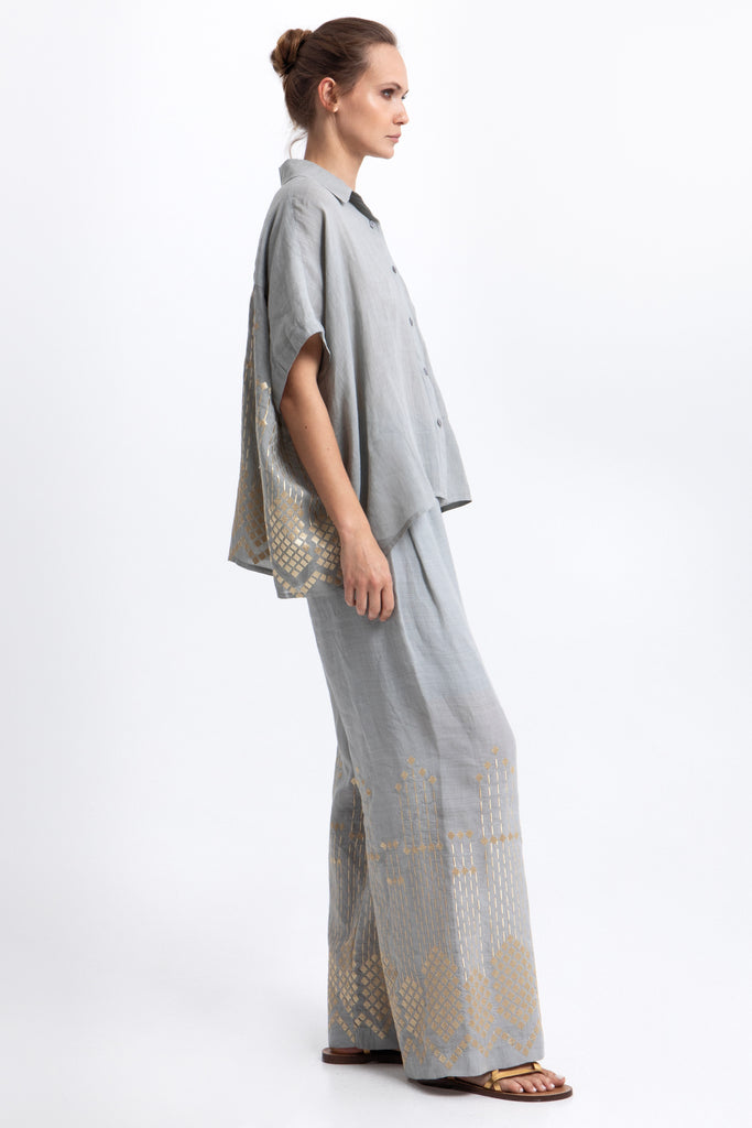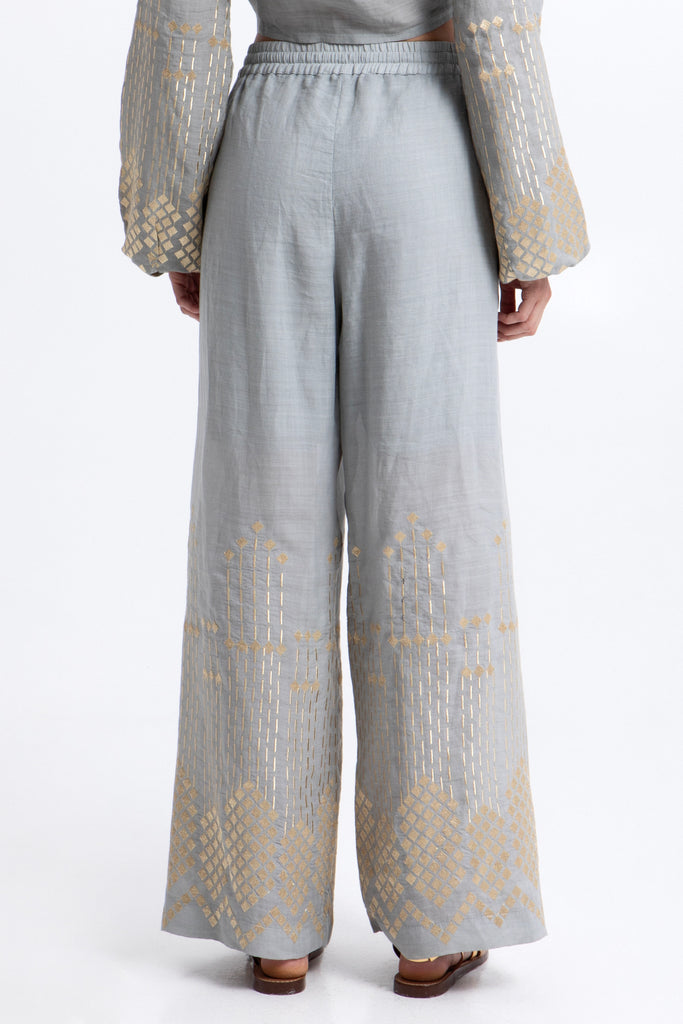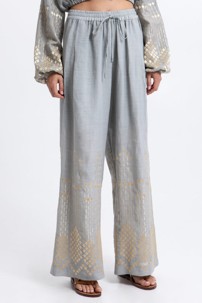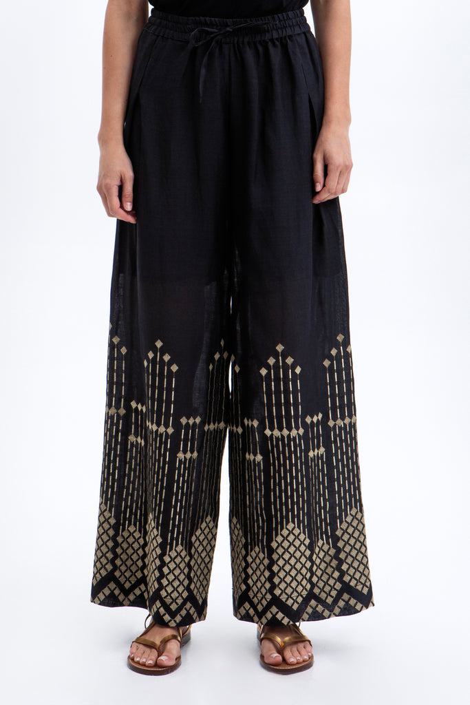 This embroidery is a stunning interplay of geometric diamond patterns and elongated vertical stitches, creating the impression of cascading grapevines, while the golden threads echo the ripened fruit that once filled amphorae with the precious nectar.