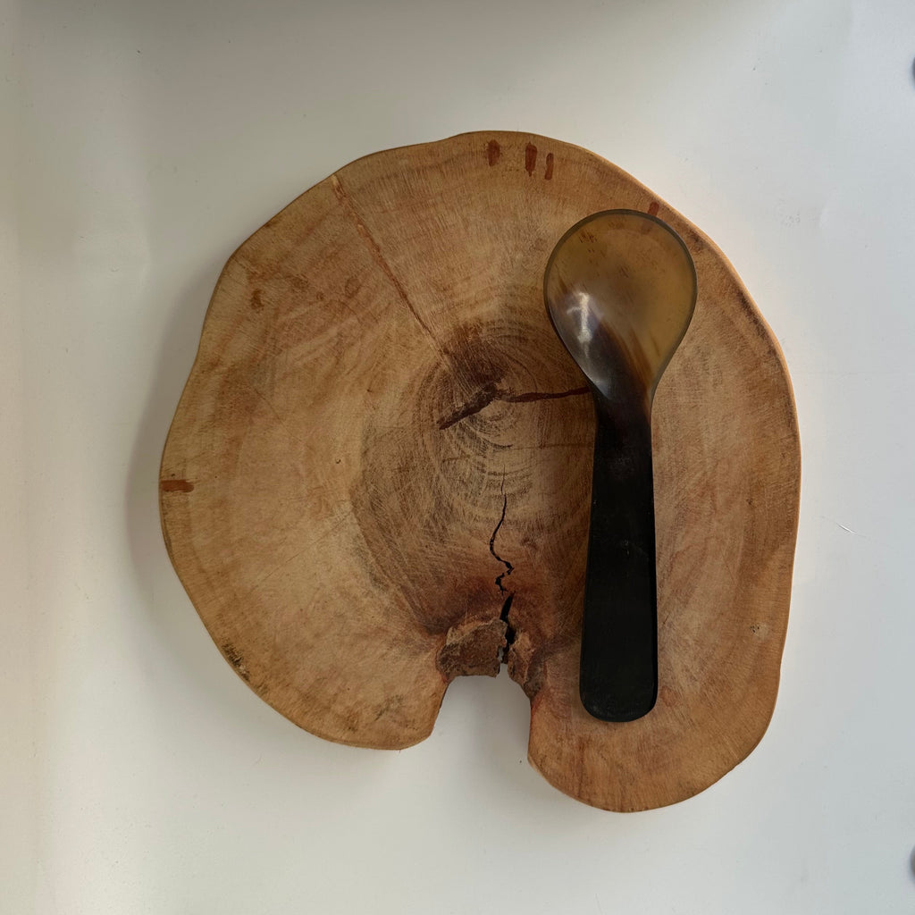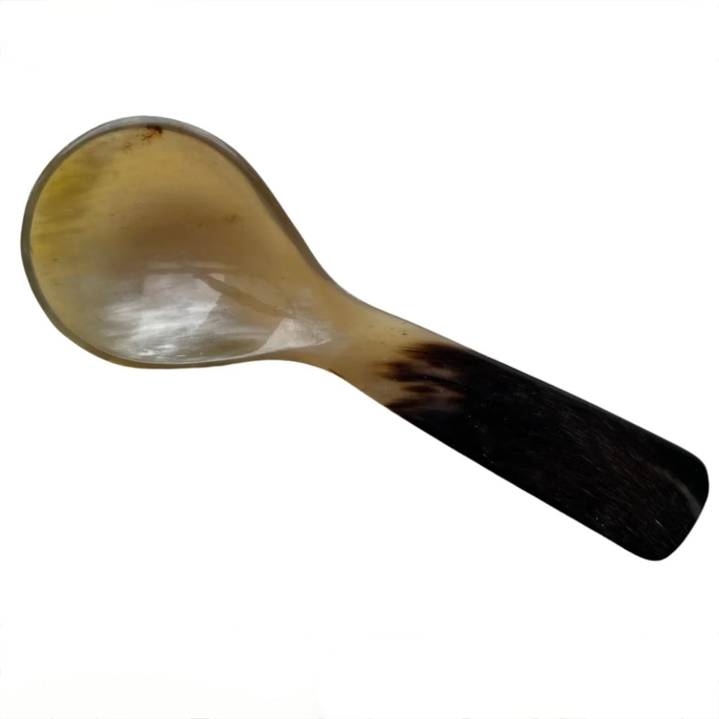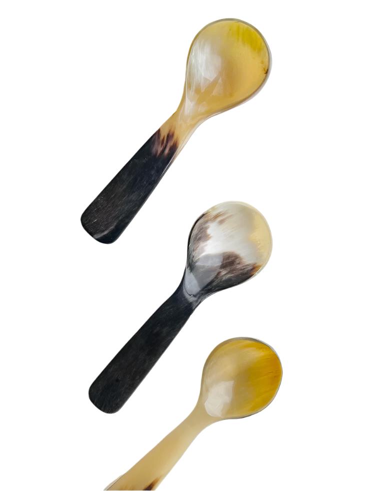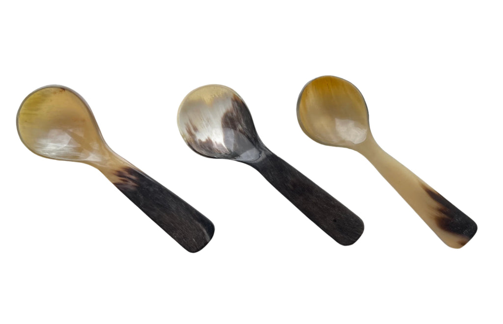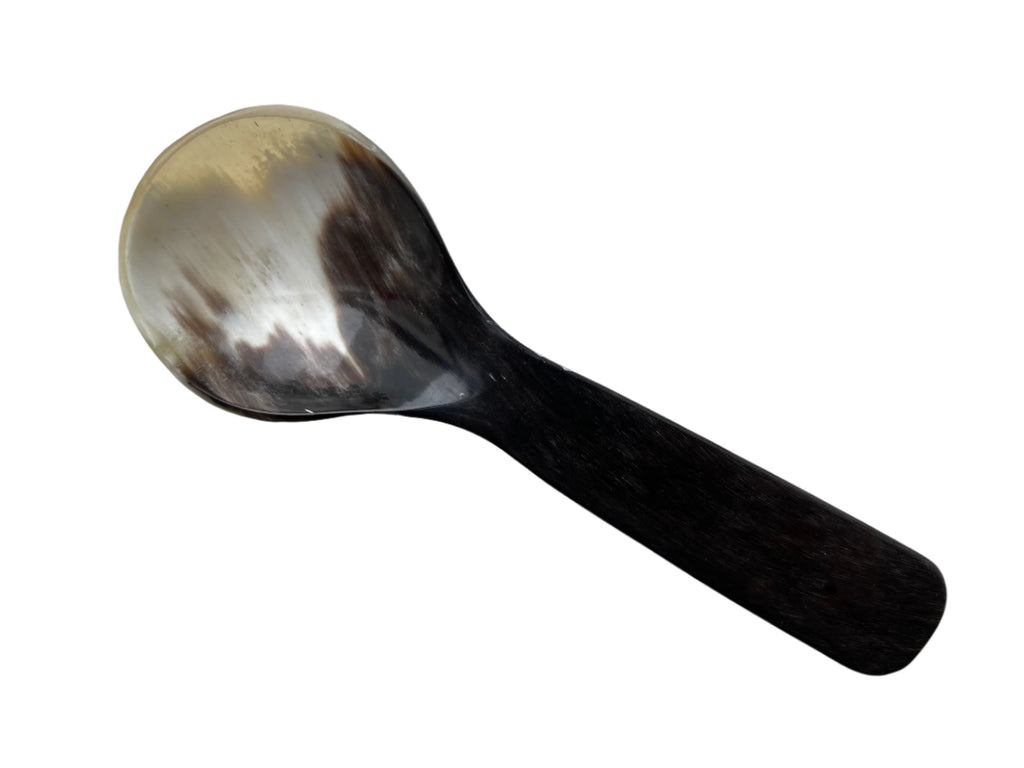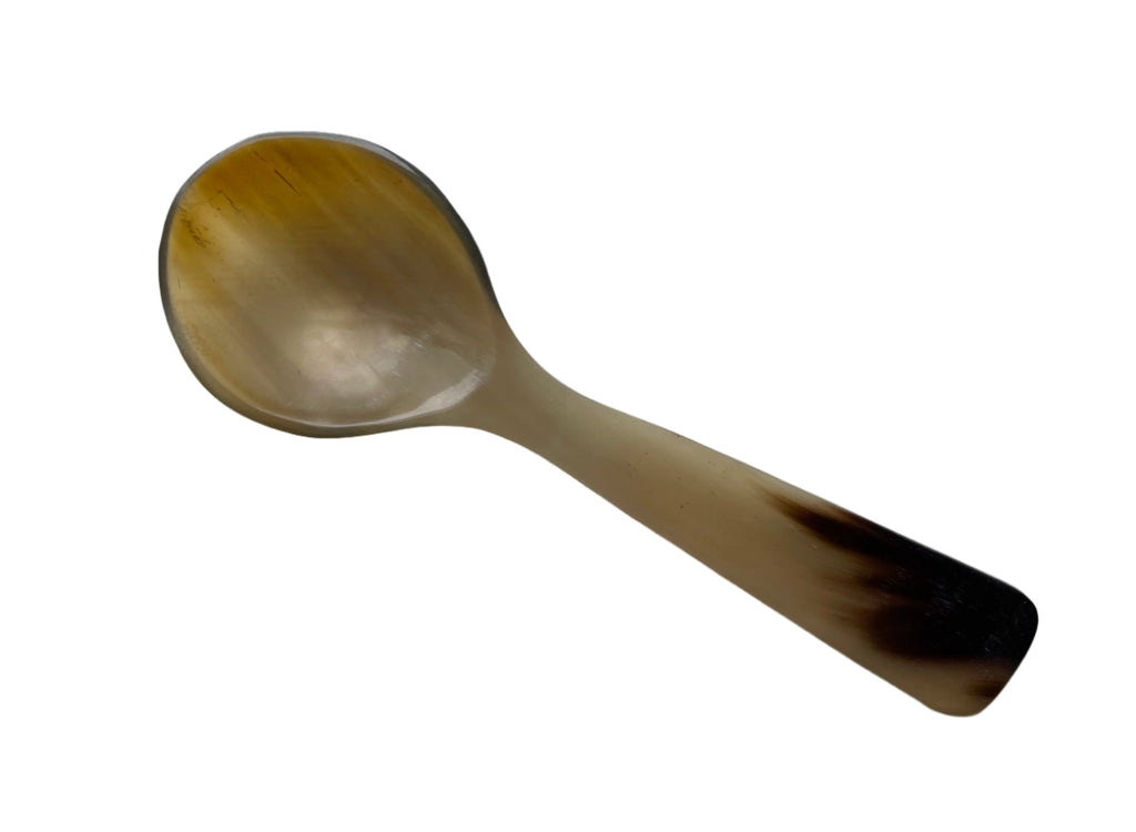 Carved from cow horn, this large spoon brings natural detailing to the table. Each spoon will vary beautifully in color.