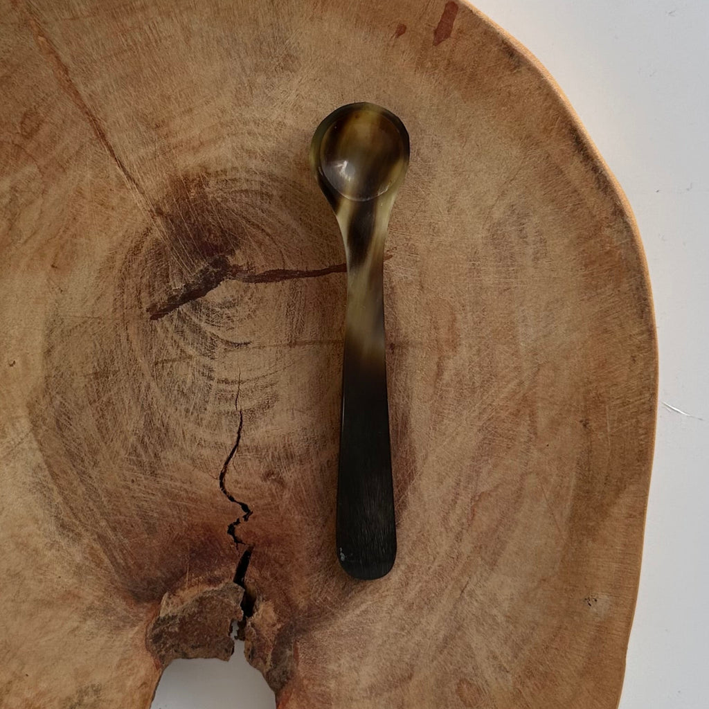 Carved from cow horn, this mini spoon brings natural detailing to the table. Sized right for scooping sugar crystals out of the Sugar bowl. Each spoon will vary beautifully in color.
