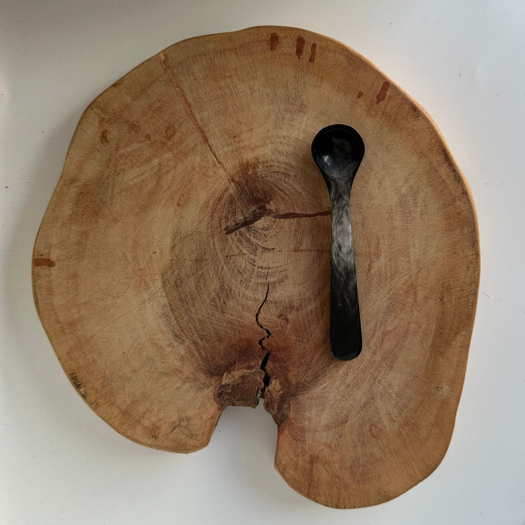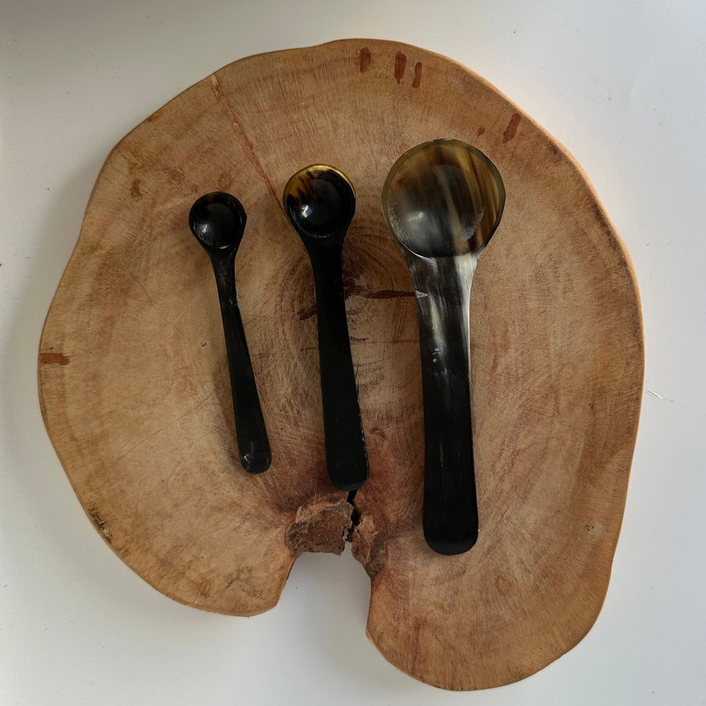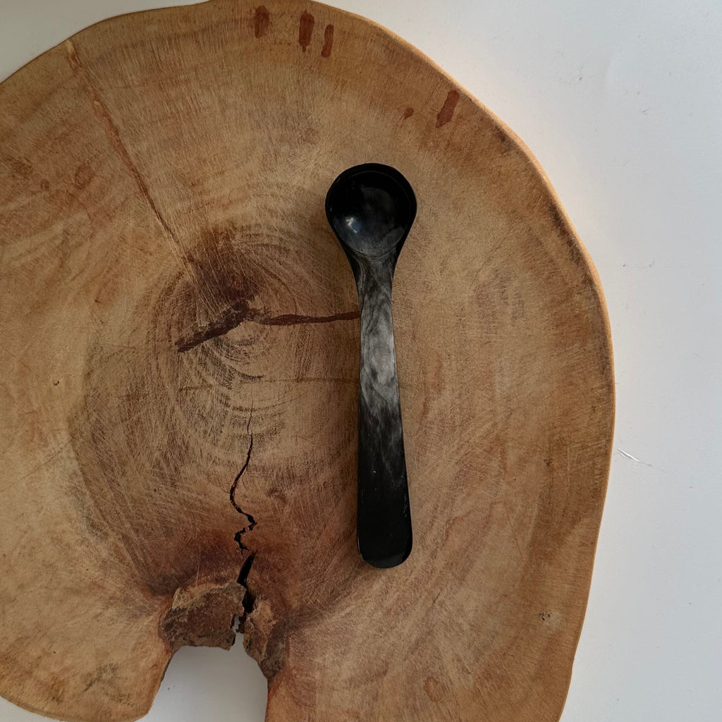Carved from cow horn, this mini spoon brings natural detailing to the table. Sized right for scooping sugar crystals out of the Sugar bowl. Each spoon will vary beautifully in color.