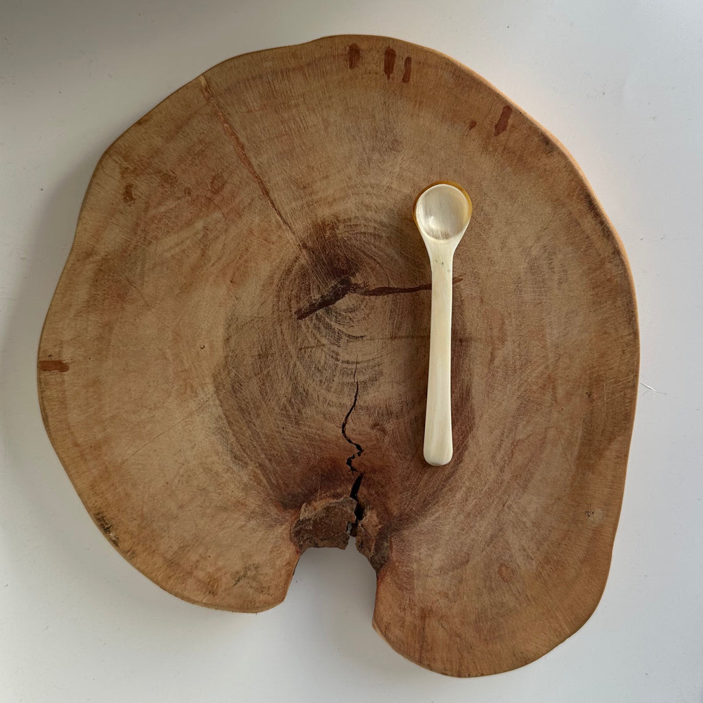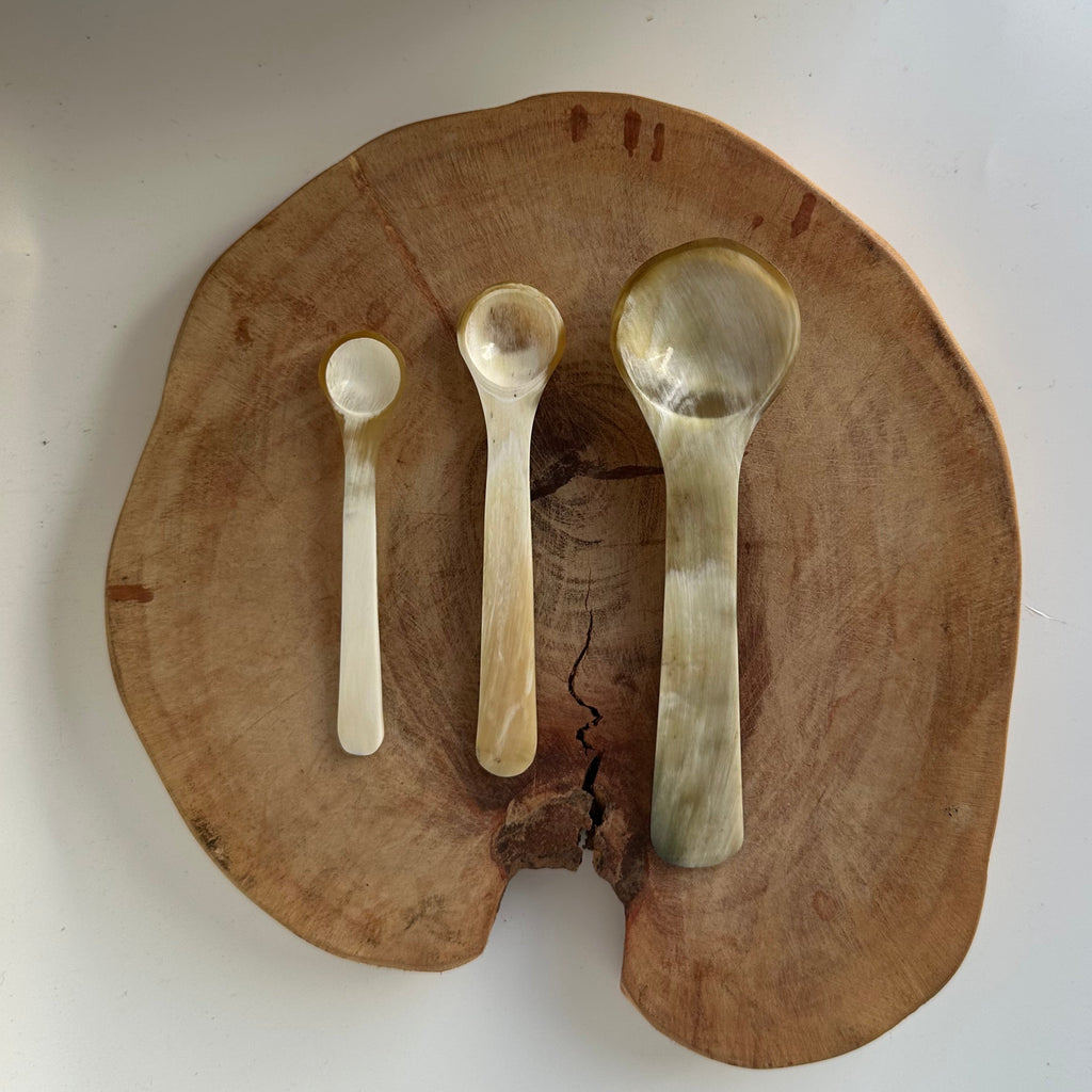 Carved from cow horn, this mini spoon brings natural detailing to the table. Sized right for scooping sugar crystals out of the Sugar bowl. Each spoon will vary beautifully in color.