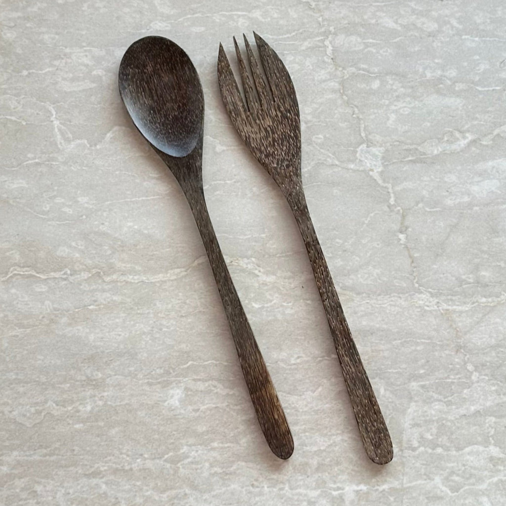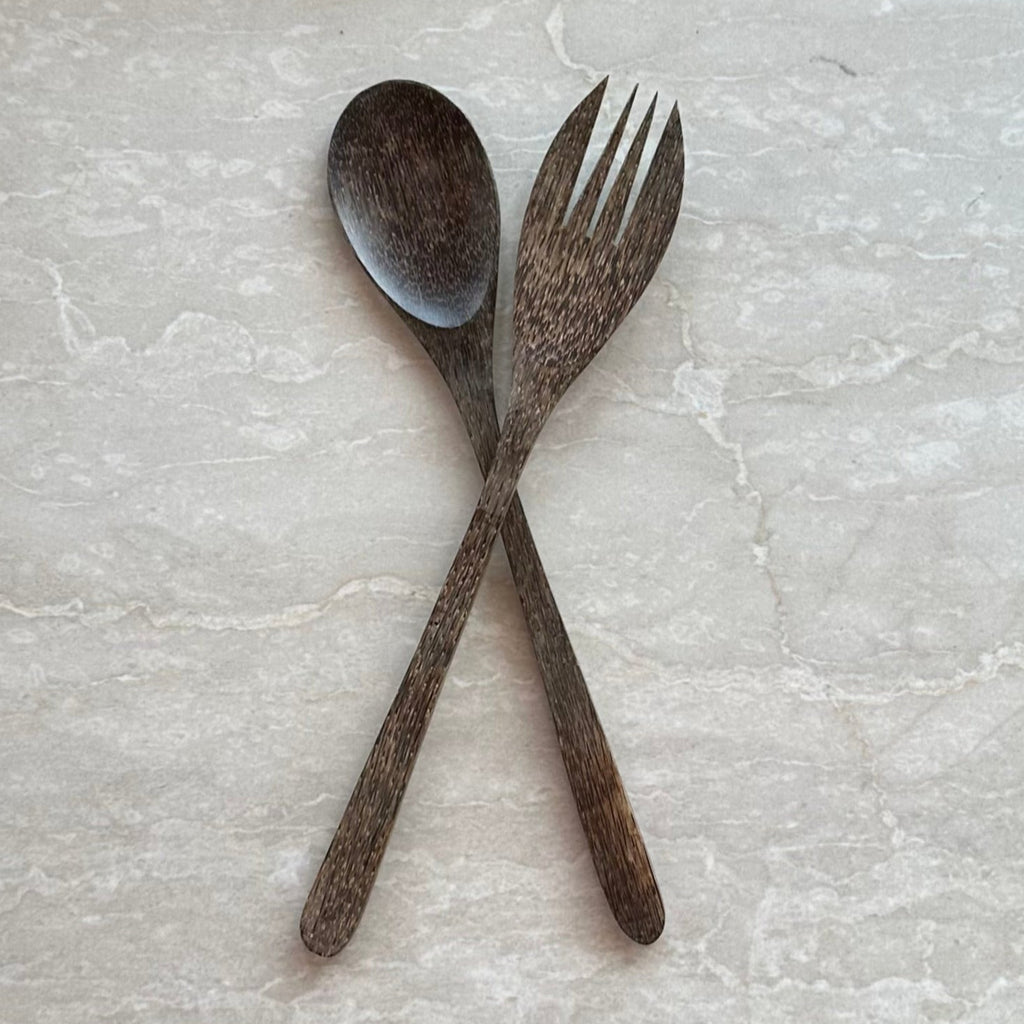 A handcrafted coconut wood salad servers. These wooden utensils are useful for tossing and serving pastas or salads. This pair is the Classic Set. Coconut Wood has a naturally beautiful and distinctive grain.