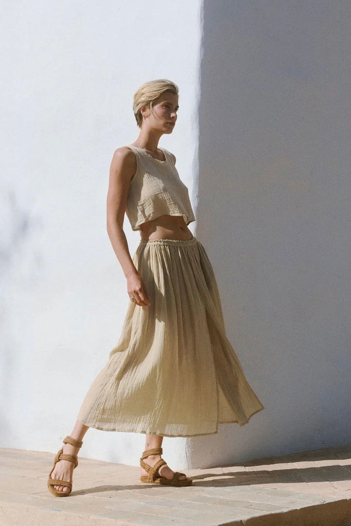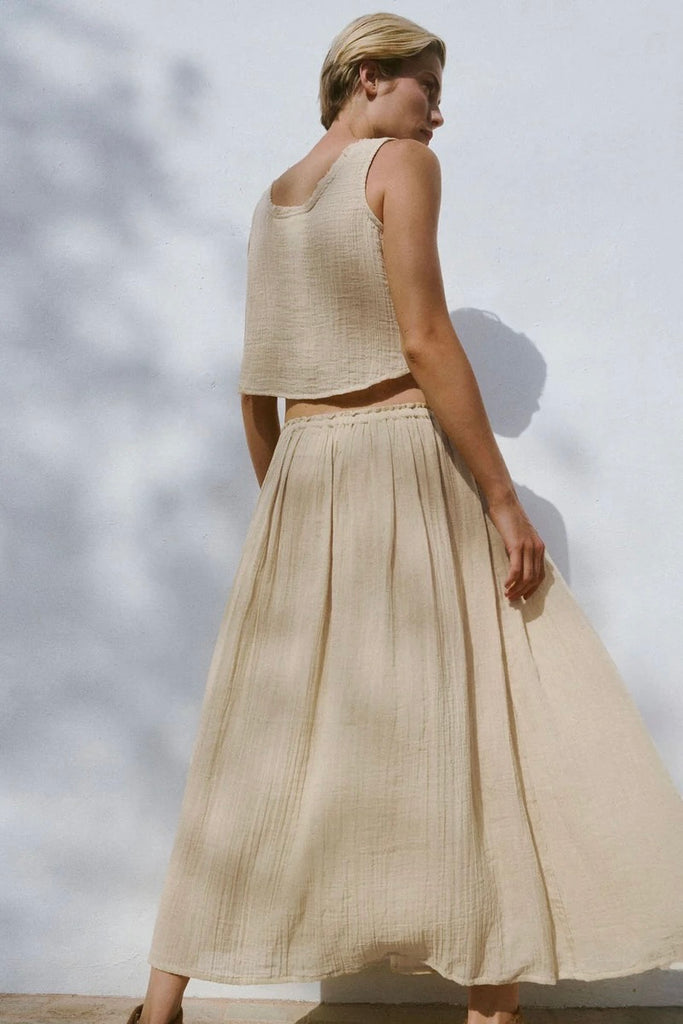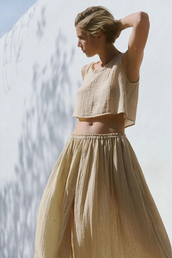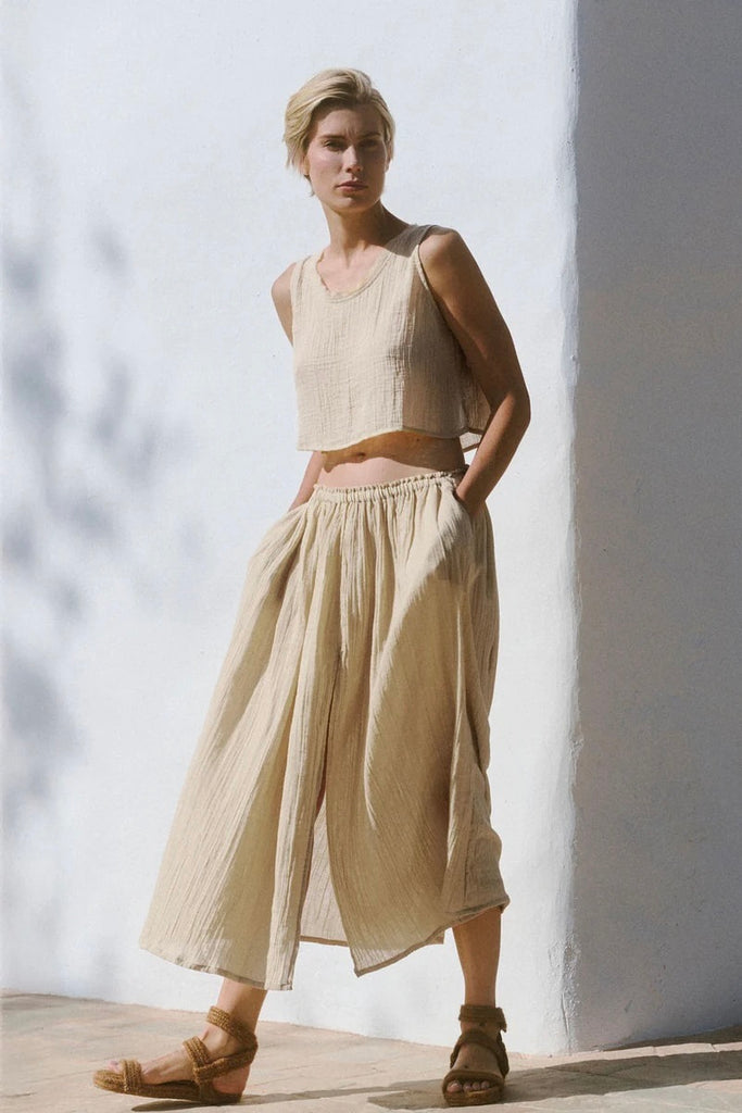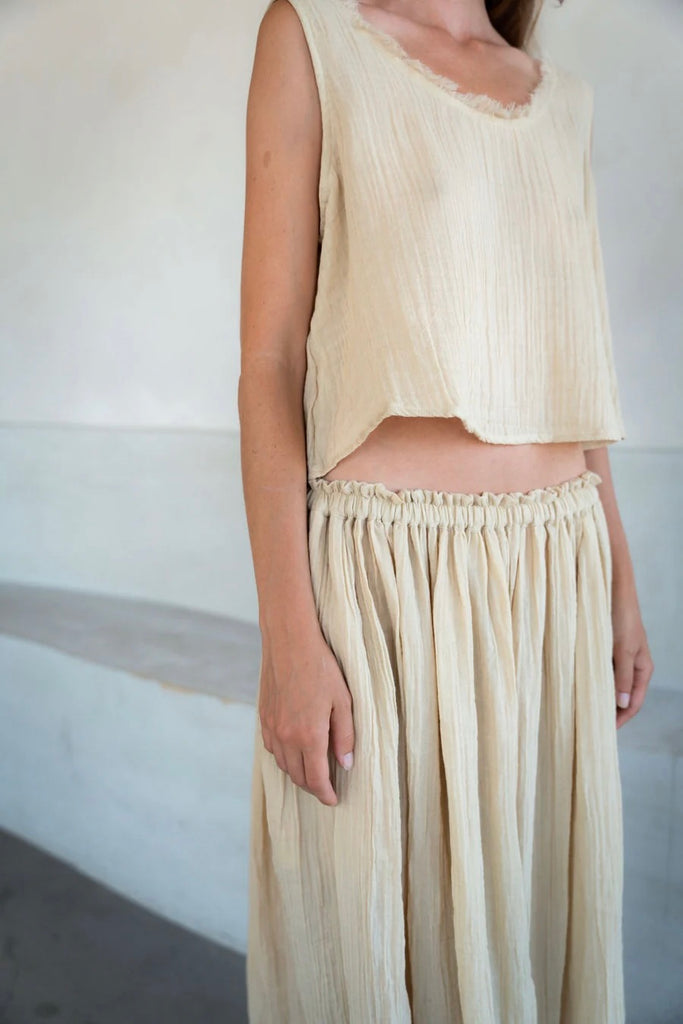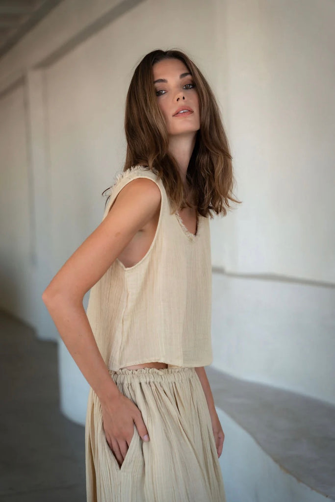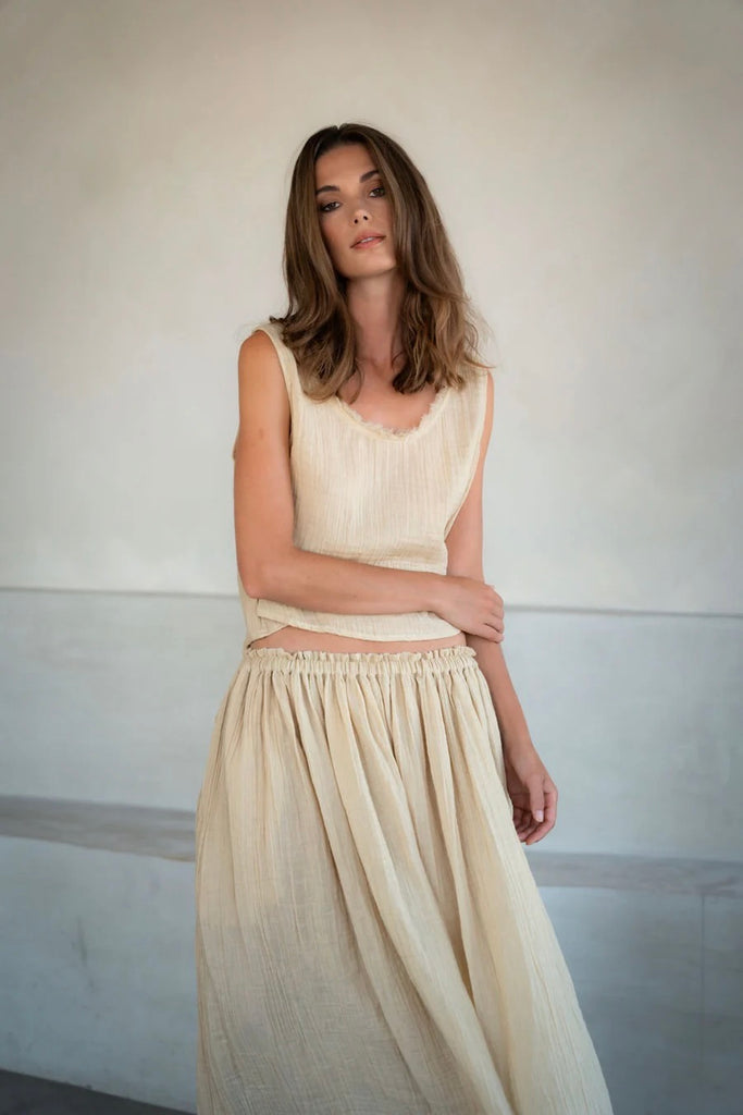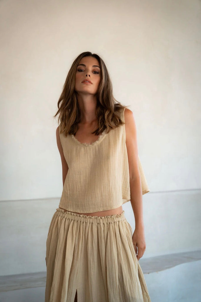 The Lamu top is crafted from butter soft organic cotton gauze. A Spring wardrobe hero for ease and grace. A relaxed fit with scooping neck and raw fringed seams. A wide boxy cut. Wear with the matching Lamu skirt for a paired back and chic go to look.