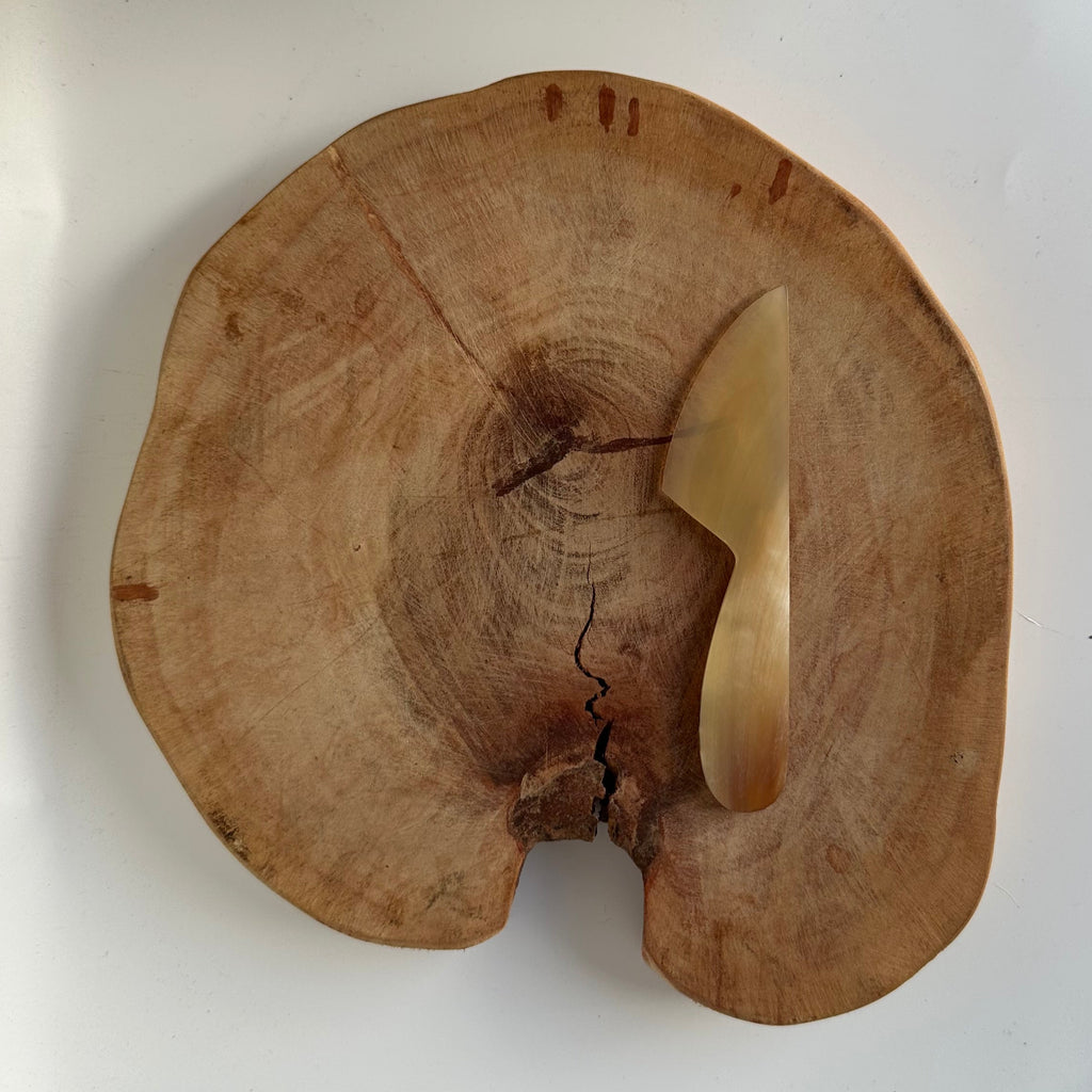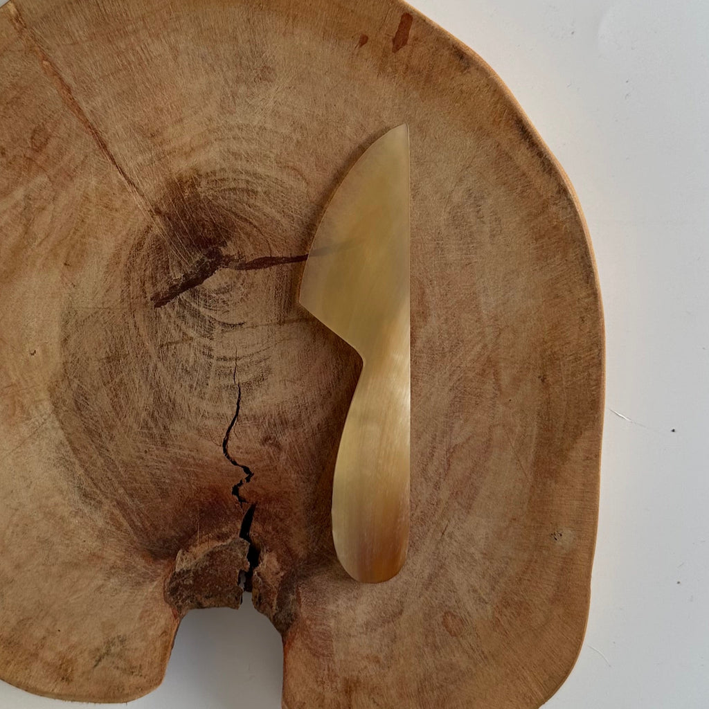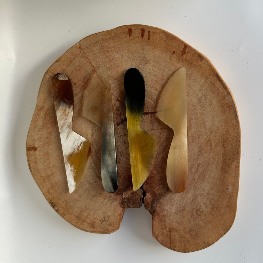 Carved from cow horn, this cheese knife brings natural detailing to the table. Use it for cheese or butter. Each knife will vary beautifully in color.