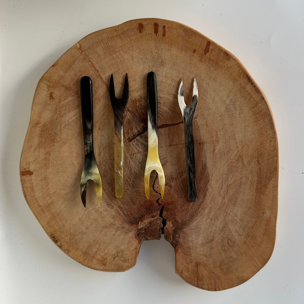 Carved from cow horn, this mini fork brings natural detailing to the table. Each fork will vary beautifully in color.