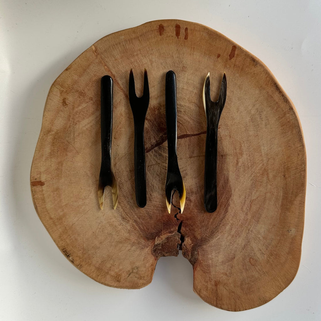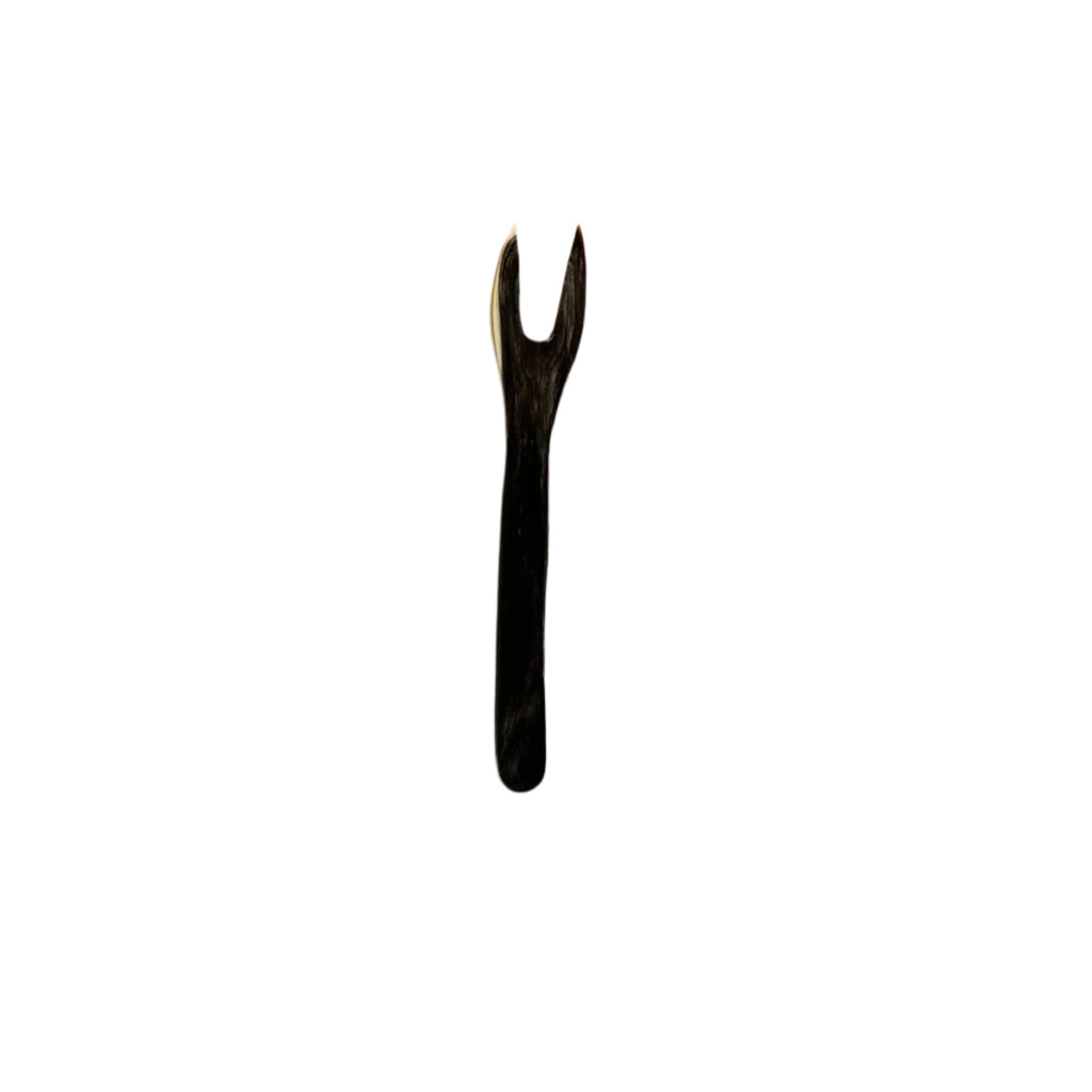 Carved from cow horn, this mini fork brings natural detailing to the table. Each fork will vary beautifully in color.