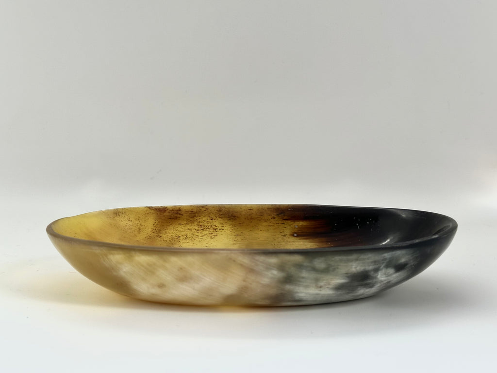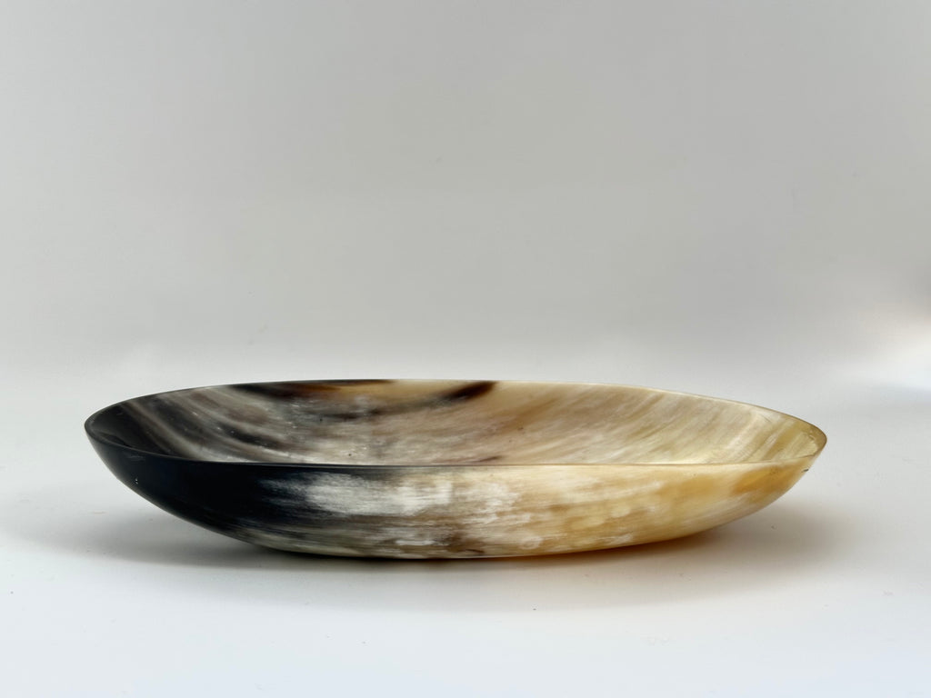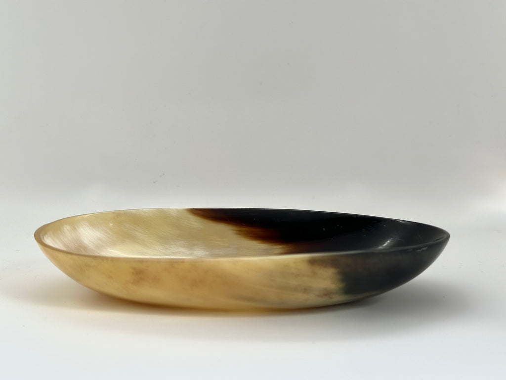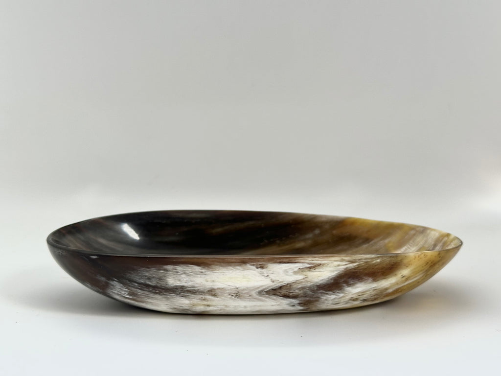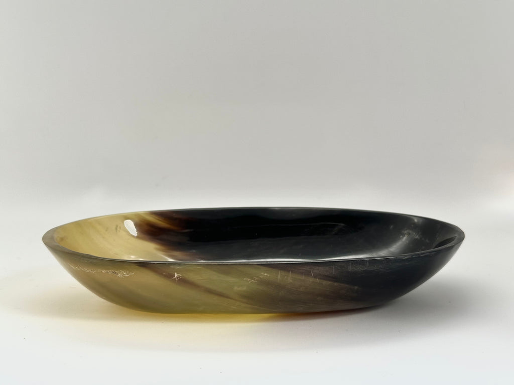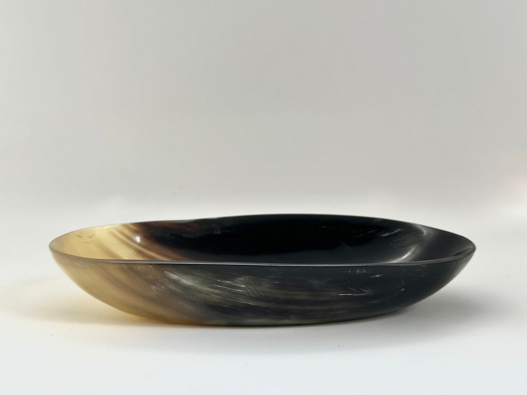 Natural horn is heated and molded into a sculptural oval bowl to serve up dishes or store trinkets. Varying dark tones and subtle shape difference make each bowl unique.