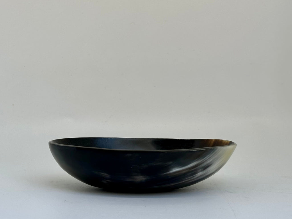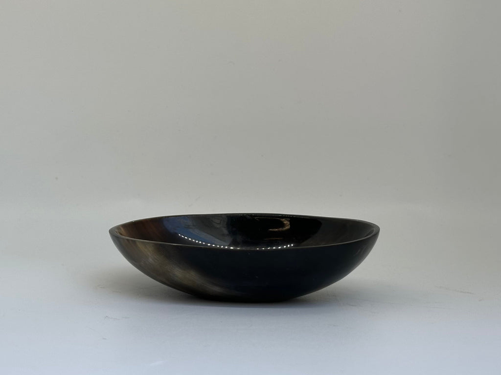 Natural horn is heated and molded into a sculptural oval bowl to serve up dishes or store trinkets. Varying dark tones and subtle shape difference make each bowl unique.