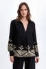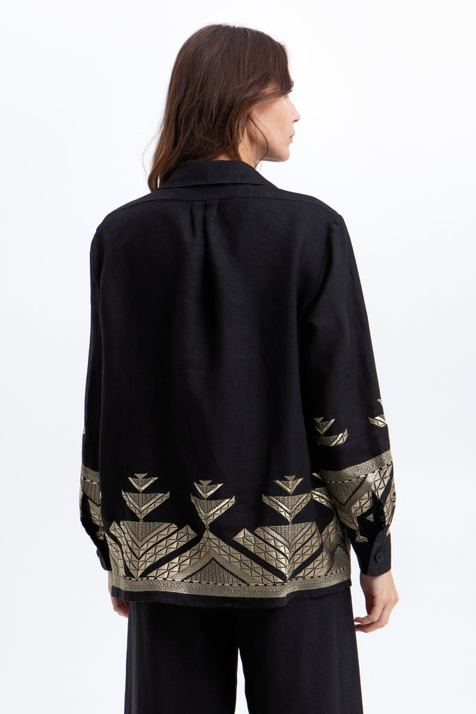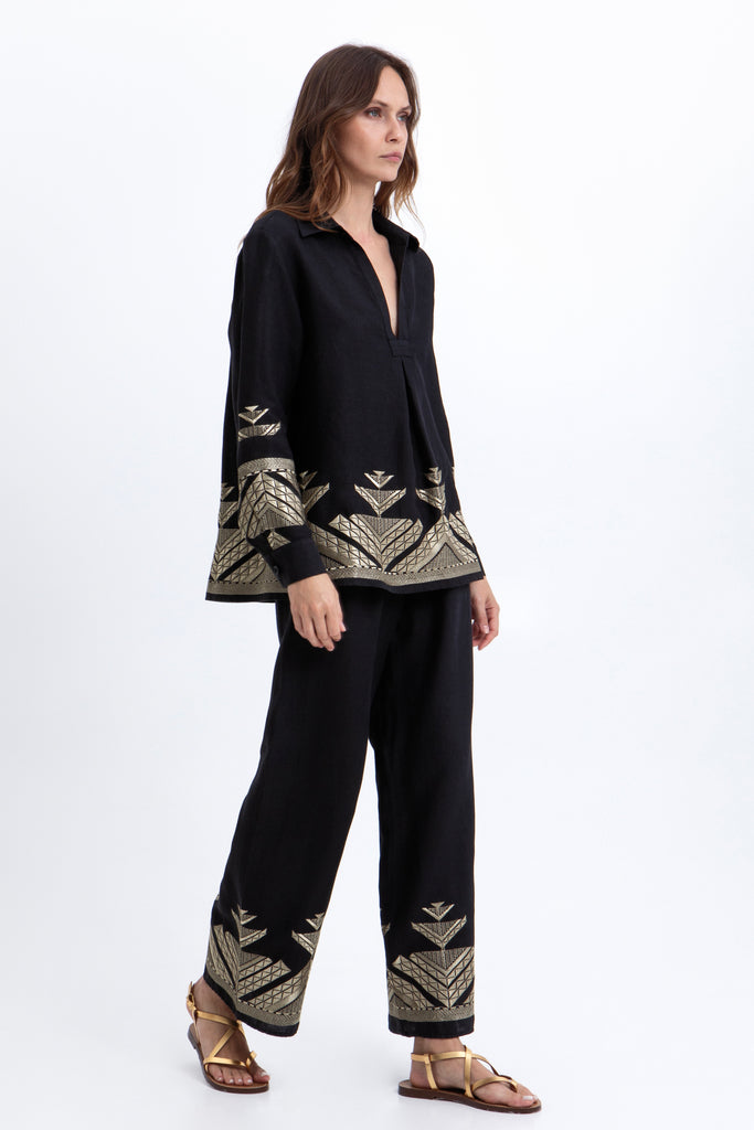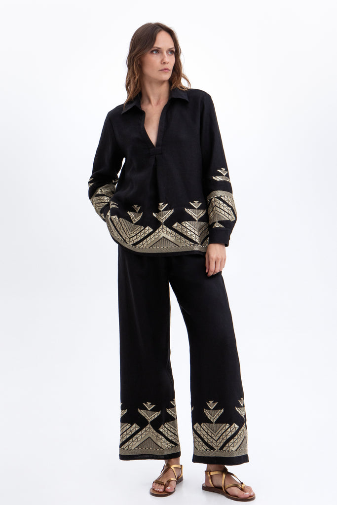 This embroidery features geometric, symmetrical patterns that resemble the pyramids. The pyramids were considered a stairway for the pharaoh's ka to reach the heavens, referring to the ancient mound of creation .