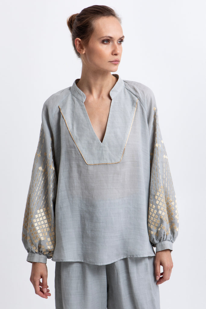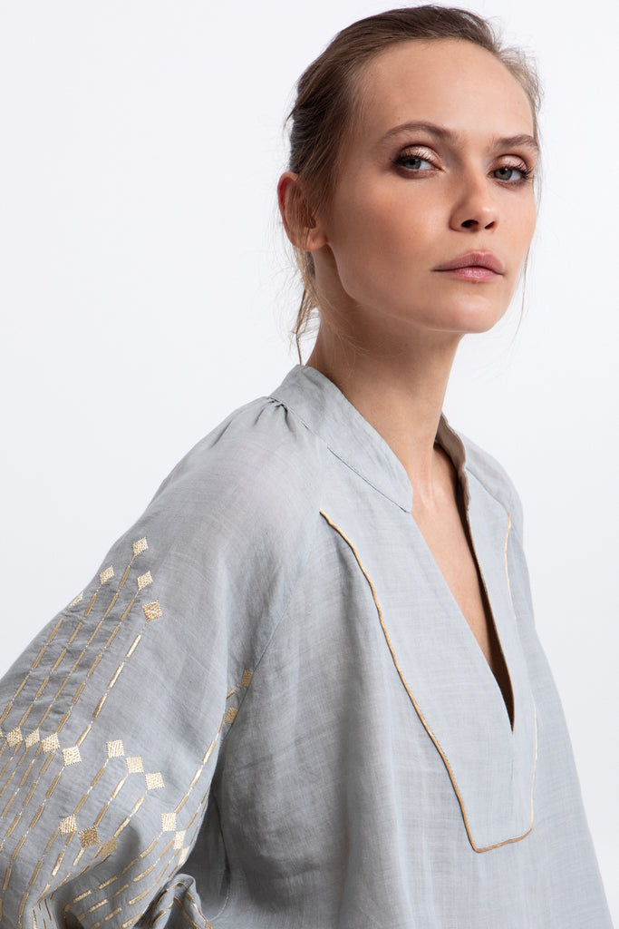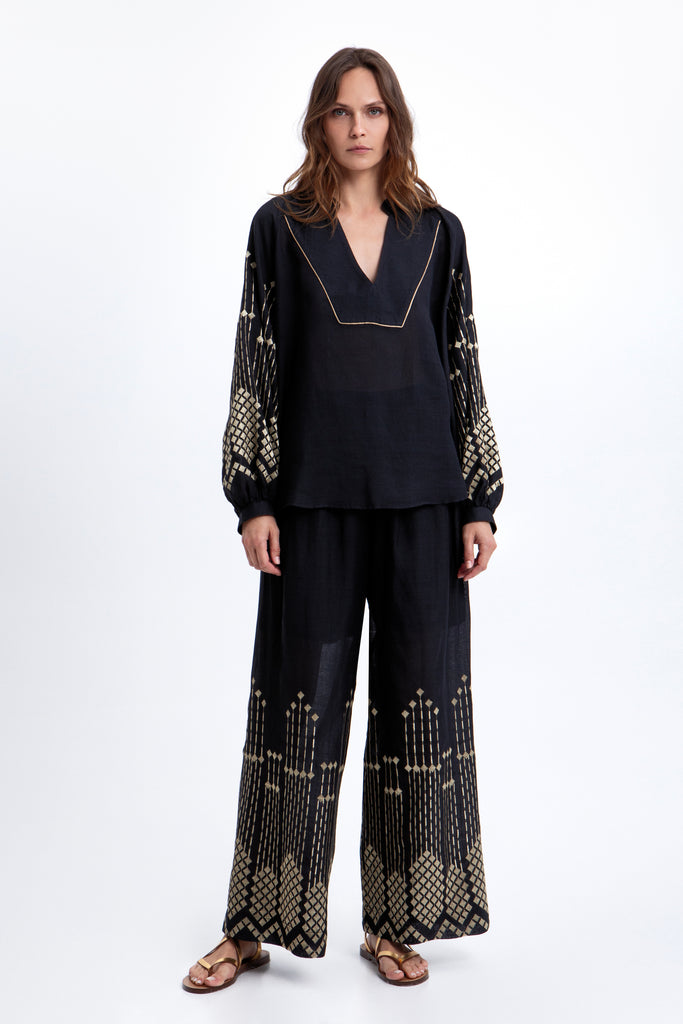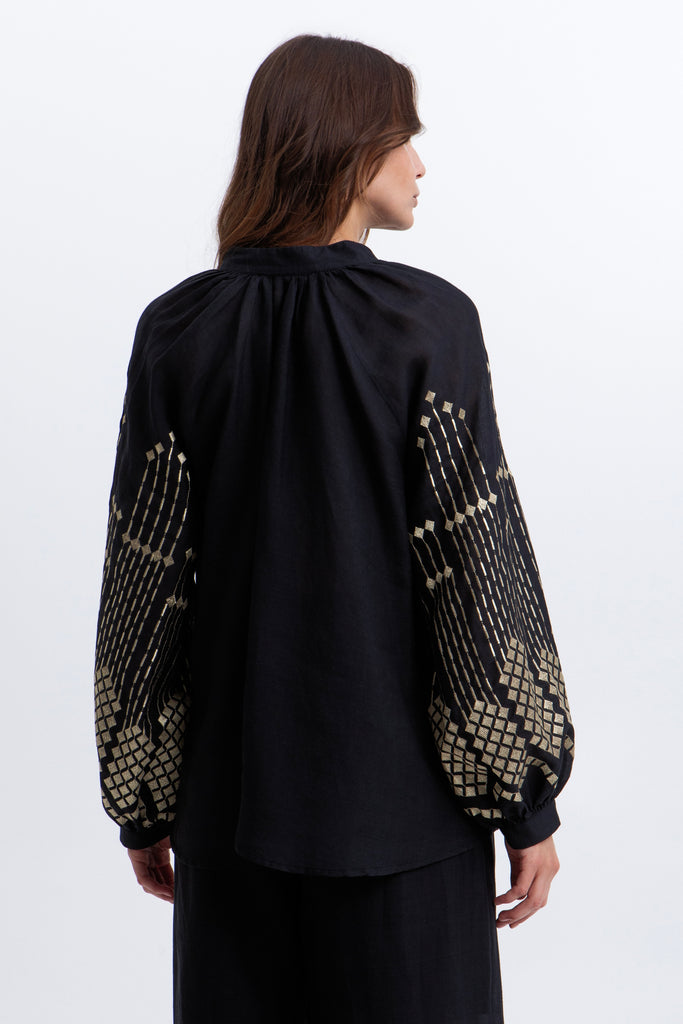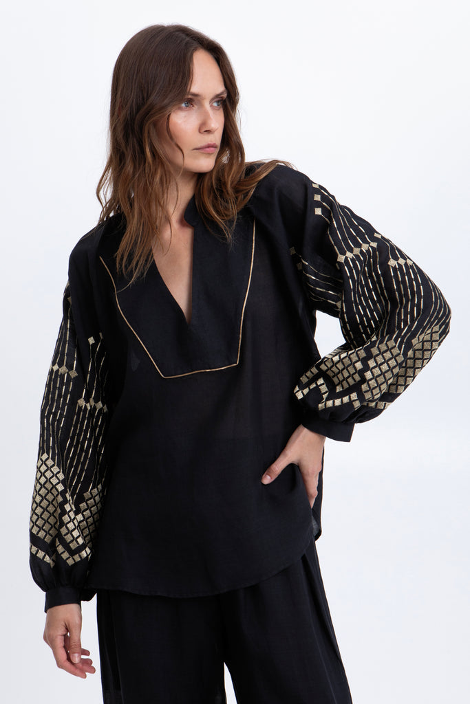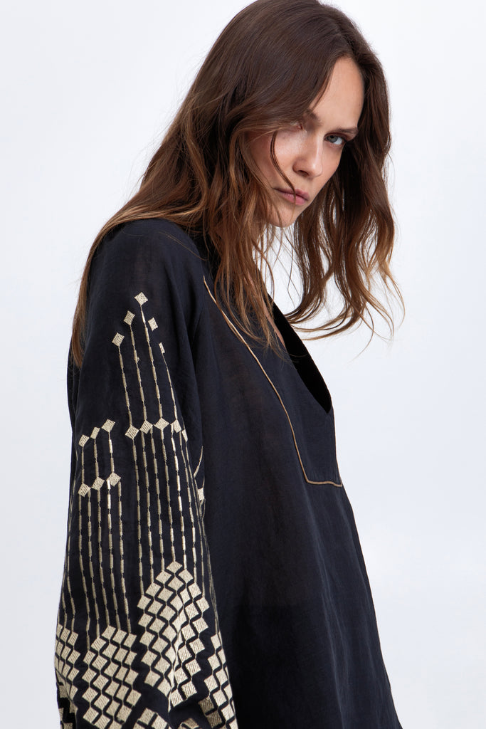 This embroidery is a stunning interplay of geometric diamond patterns and elongated vertical stitches, creating the impression of cascading grapevines, while the golden threads echo the ripened fruit that once filled amphorae with the precious nectar.