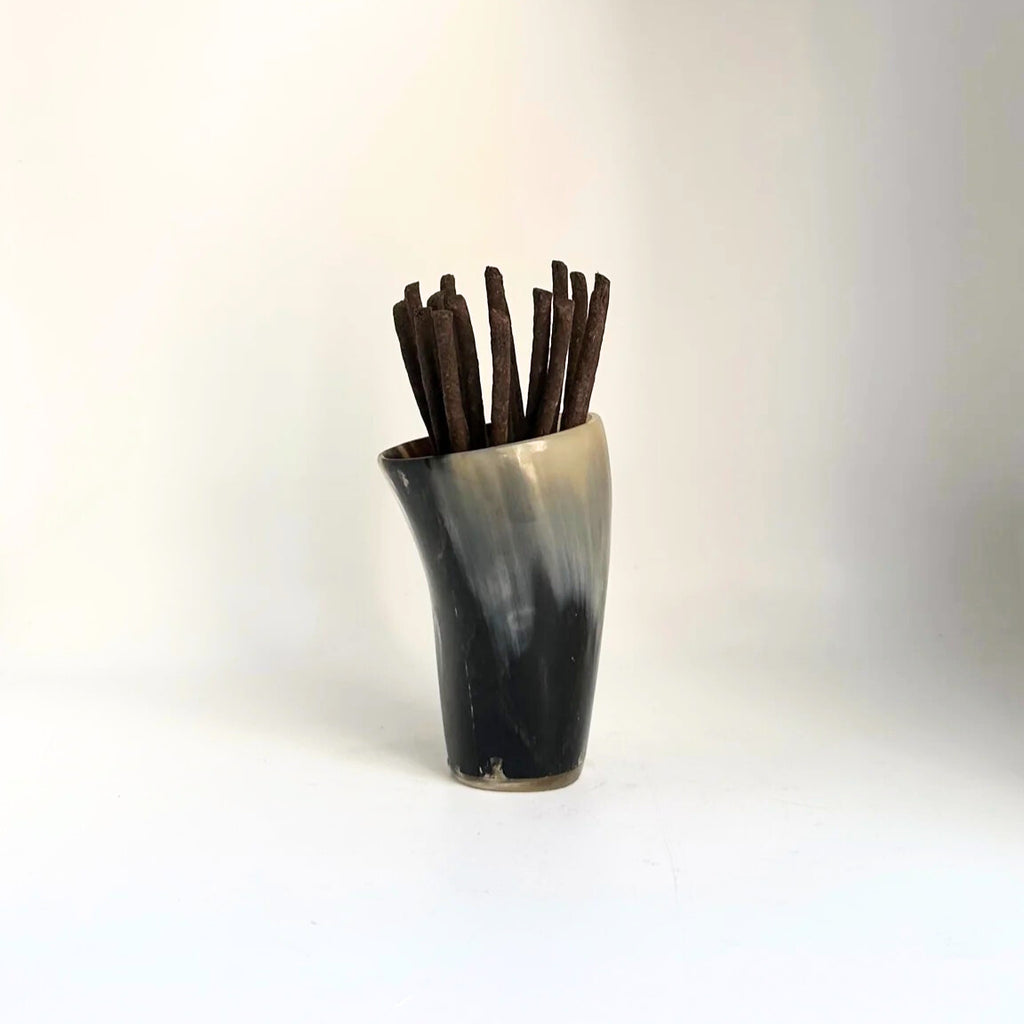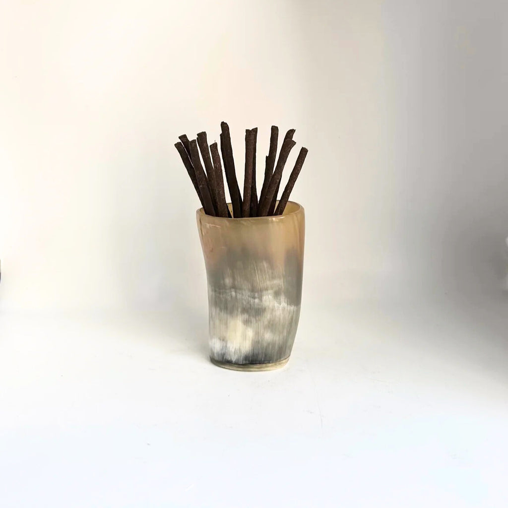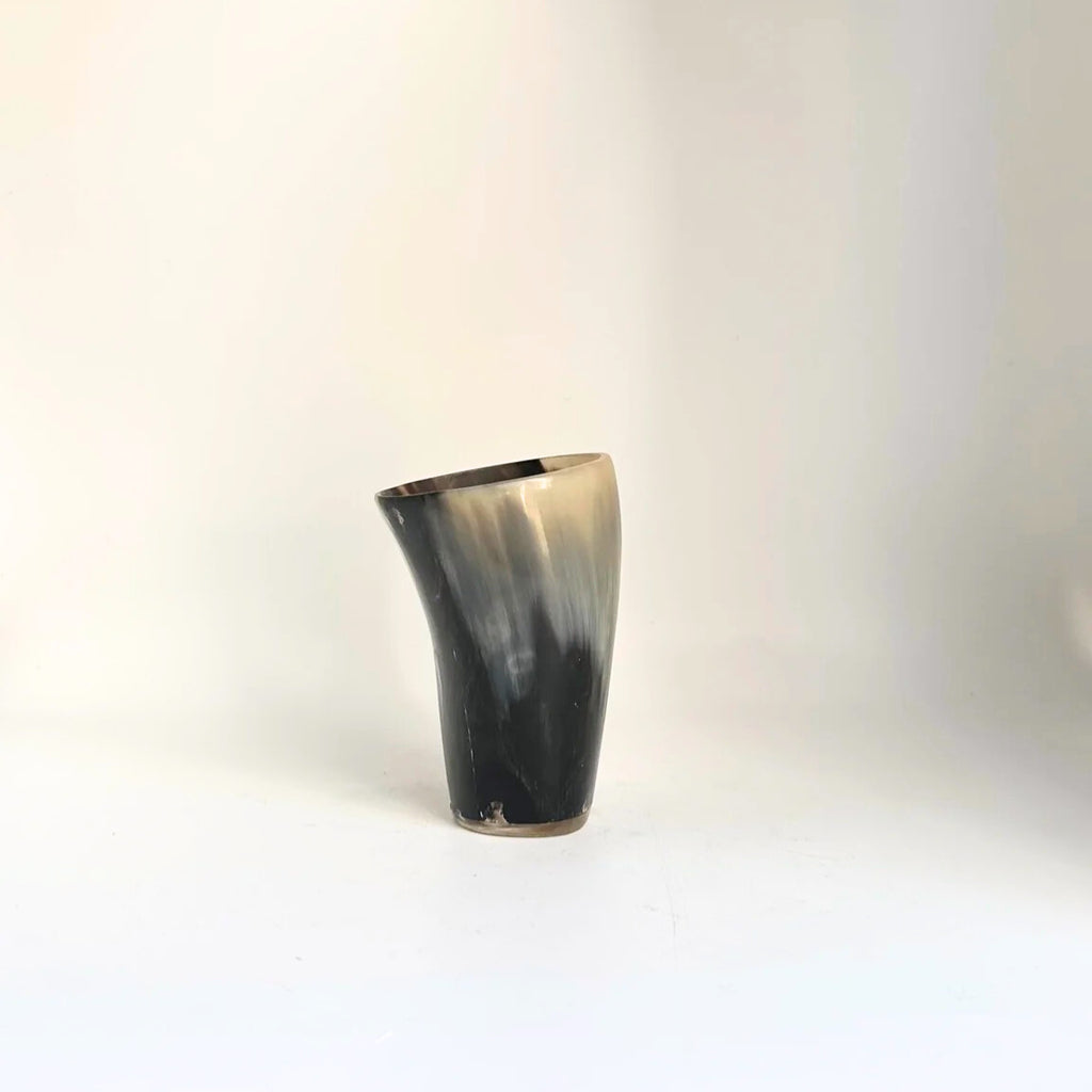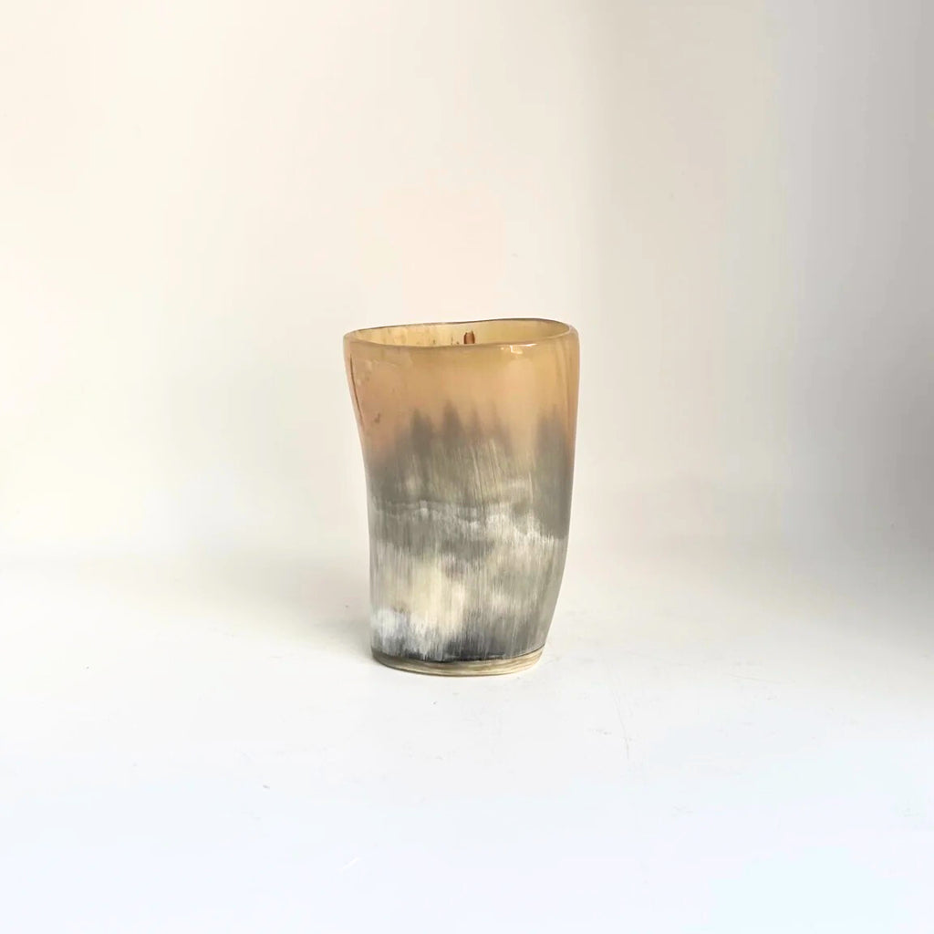 Natural horn is heated and molded into a sculptural cup. Varying light-to-dark tones and subtle shape difference make each cup unique.